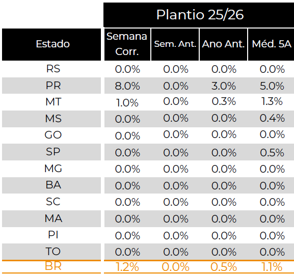 Até o dia 19 de setembro, 1,2% da área de soja projetada estava plantada no Brasil. Em mesmo período do ano passado, o percentual era 0,5%, enquanto a média das últimas cinco safras para o período é 1,1%.