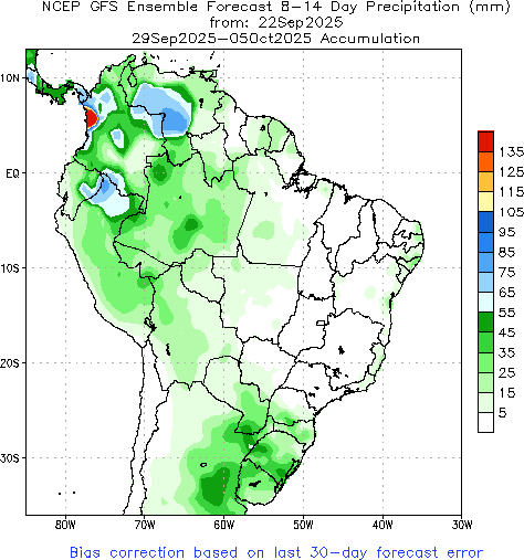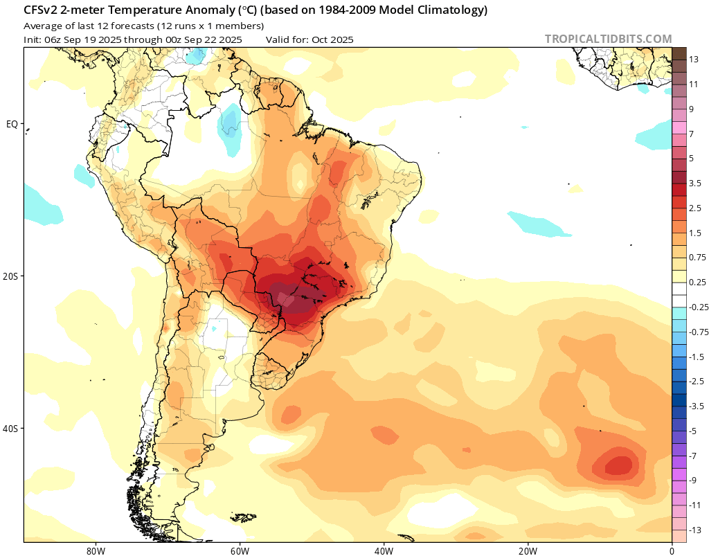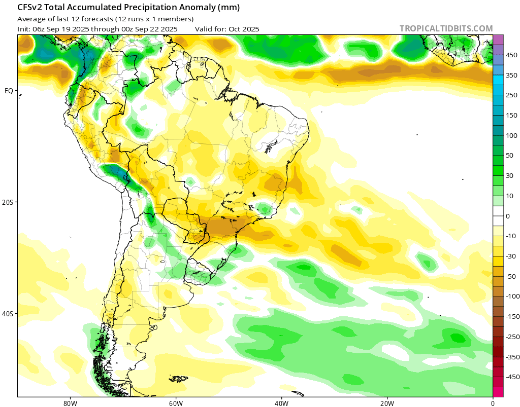 Olhando mais para frente, o mapa de anomalia de precipitações para o mês de outubro aponta para chuvas abaixo da média na maioria dos principais estados produtores do país, com destaque para o estado do Paraná.
