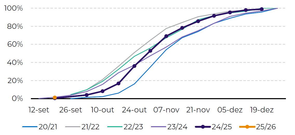 A tendência é vermos um novo aumento na área brasileira de soja na temporada 2025/26, o que deve trazer o potencial para uma nova safra recorde. Apesar disso, destacamos que a expansão da área deve ser menor do que em anos anteriores, visto que as margens dos produtores estão “mais apertadas” devido ao aumento dos custos e redução nas cotações médias da soja em relação a outras temporadas. De qualquer forma, o potencial produtivo brasileiro deve se aproximar de 180 milhões de toneladas em 2025/26! Se confirmada, será a maior produção da história do Brasil. Mas, o clima precisa ajudar.