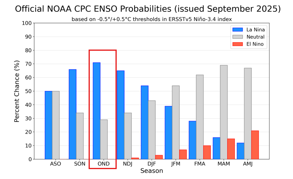 Nesse sentido, é importante destacarmos que é possível vermos novamente a incidência do fenômeno La Niña sobre a safra brasileira de verão. A última atualização da Administração Oceânica e Atmosférica Nacional (NOAA, na sigla em inglês) aponta para uma probabilidade de 71% de o La Niña se desenvolver entre outubro, novembro e dezembro. Tal fato merece atenção, pois o fenômeno La Niña tem como padrão chuvas abaixo da média na Região Sul do Brasil, o que coloca em risco as lavouras do Paraná, Rio Grande do Sul e Santa Catarina.