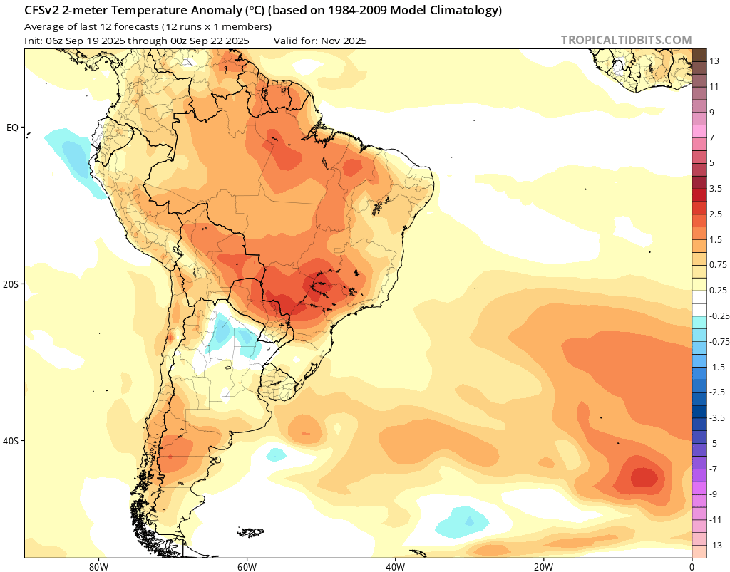 Já em relação às temperaturas, o mapa de anomalias aponta a continuidade de temperaturas acima da média na maioria dos principais estados produtores ao longo do mês de novembro, mas em patamares menos elevados do que os esperados para outubro.