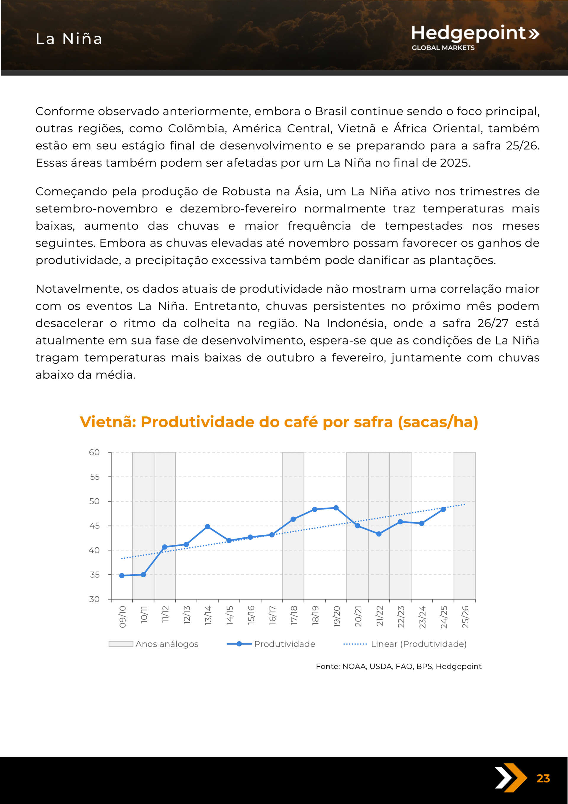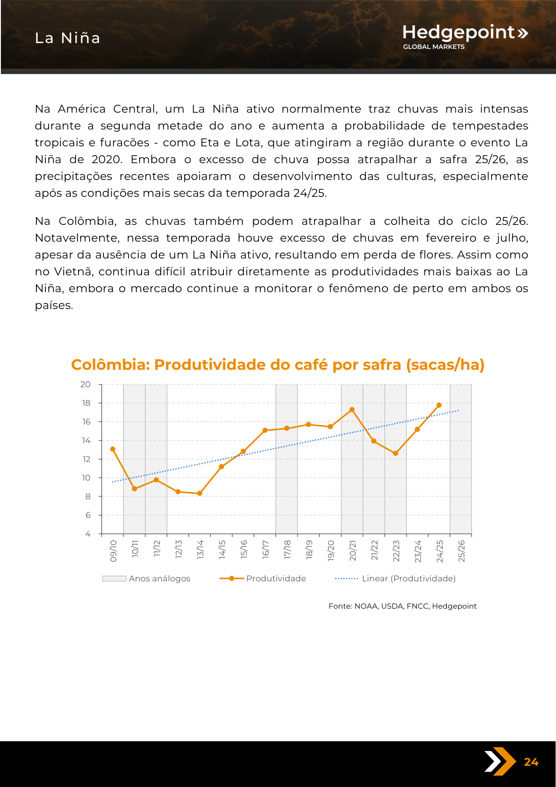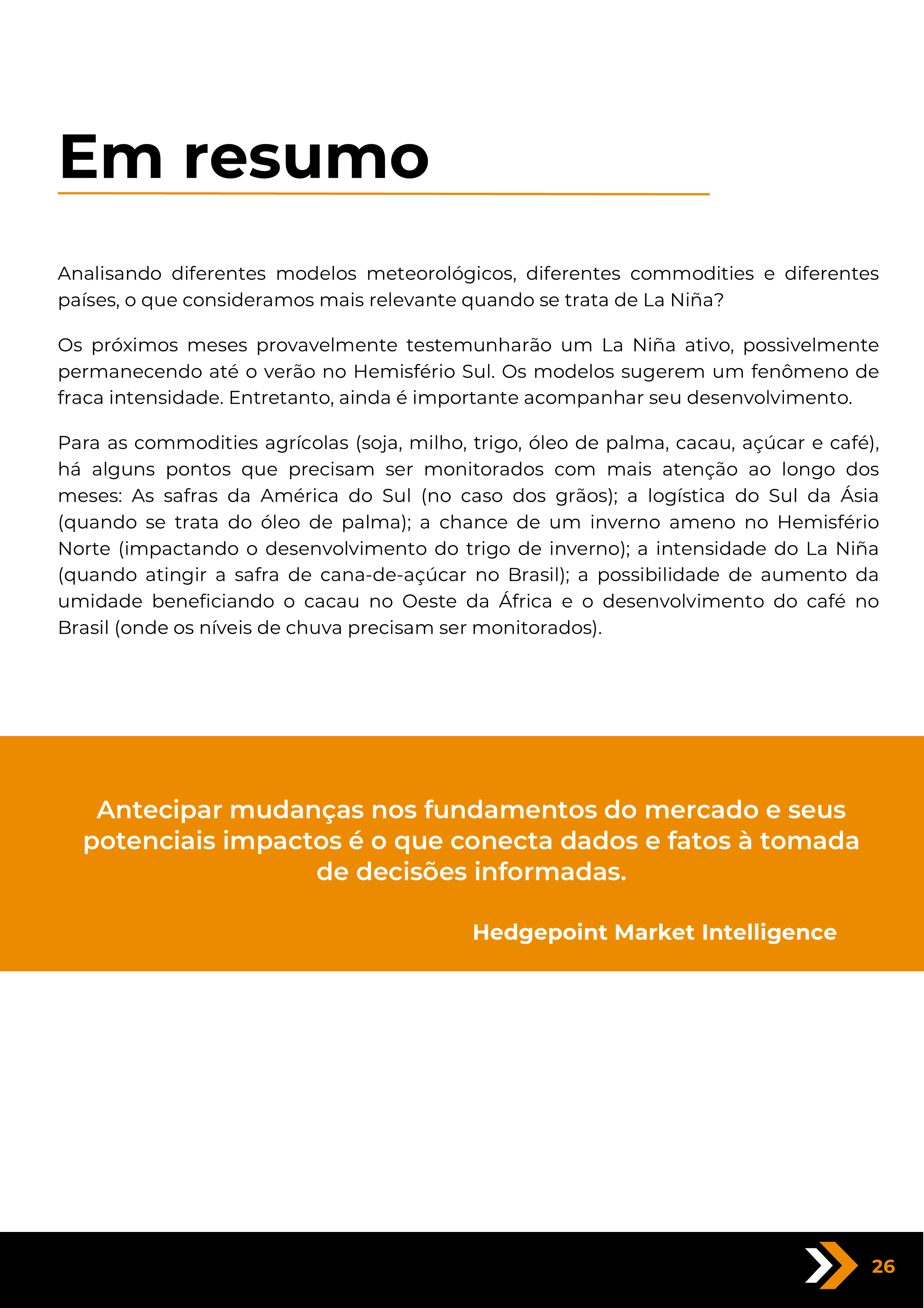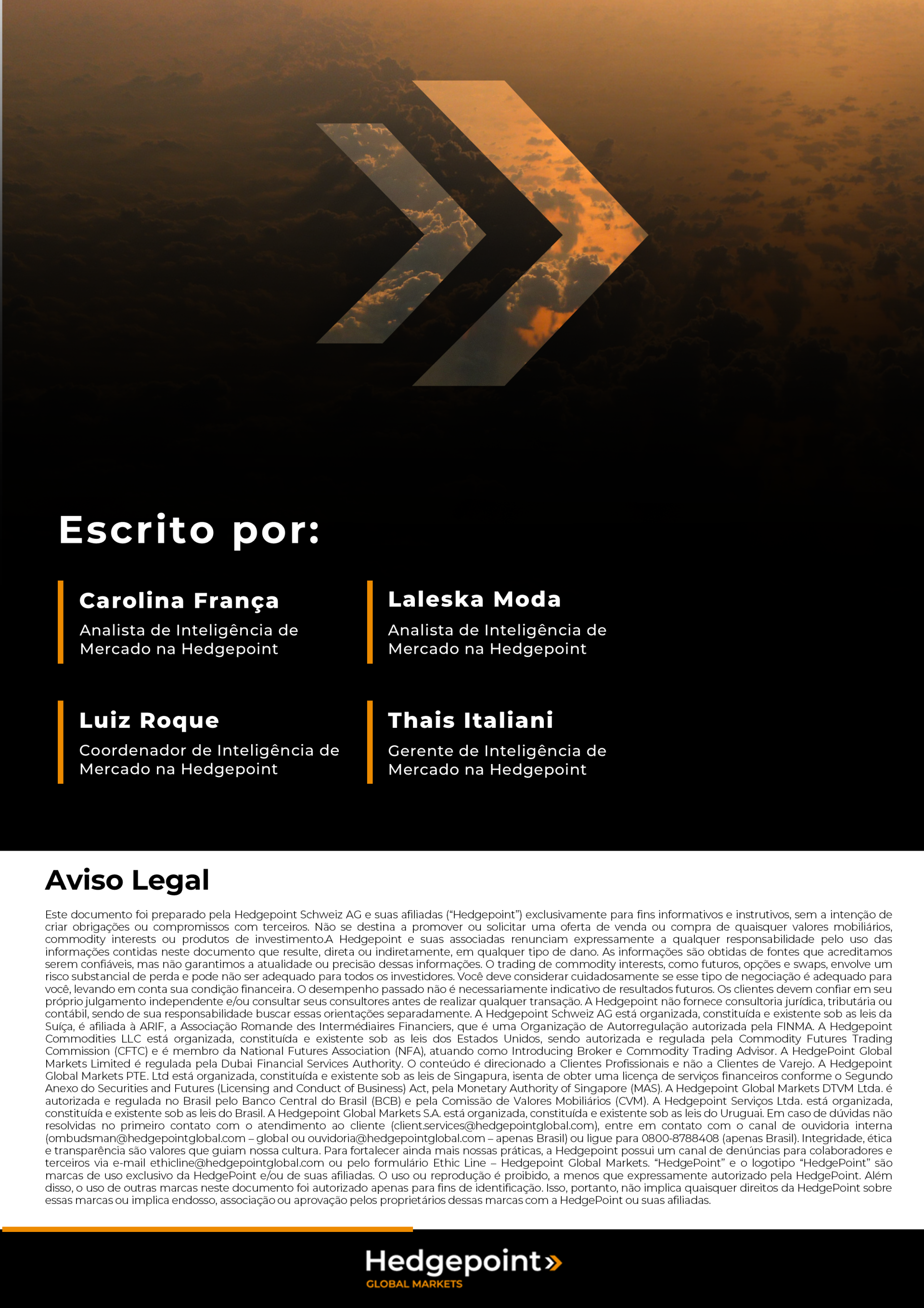 Este documento foi preparado pela Hedgepoint Schweiz AG e suas afiliadas (“Hedgepoint”) exclusivamente para fins informativos e instrutivos, sem a intenção de criar obrigações ou compromissos com terceiros. Não se destina a promover ou solicitar uma oferta de venda ou compra de quaisquer valores mobiliários, commodity interests ou produtos de investimento.A Hedgepoint e suas associadas renunciam expressamente a qualquer responsabilidade pelo uso das informações contidas neste documento que resulte, direta ou indiretamente, em qualquer tipo de dano. As informações são obtidas de fontes que acreditamos serem confiáveis, mas não garantimos a atualidade ou precisão dessas informações. O trading de commodity interests, como futuros, opções e swaps, envolve um risco substancial de perda e pode não ser adequado para todos os investidores. Você deve considerar cuidadosamente se esse tipo de negociação é adequado para você, levando em conta sua condição financeira. O desempenho passado não é necessariamente indicativo de resultados futuros. Os clientes devem confiar em seu próprio julgamento independente e/ou consultar seus consultores antes de realizar qualquer transação. A Hedgepoint não fornece consultoria jurídica, tributária ou contábil, sendo de sua responsabilidade buscar essas orientações separadamente. A Hedgepoint Schweiz AG está organizada, constituída e existente sob as leis da Suíça, é afiliada à ARIF, a Associação Romande des Intermédiaires Financiers, que é uma Organização de Autorregulação autorizada pela FINMA. A Hedgepoint Commodities LLC está organizada, constituída e existente sob as leis dos Estados Unidos, sendo autorizada e regulada pela Commodity Futures Trading Commission (CFTC) e é membro da National Futures Association (NFA), atuando como Introducing Broker e Commodity Trading Advisor. A HedgePoint Global Markets Limited é regulada pela Dubai Financial Services Authority. O conteúdo é direcionado a Clientes Profissionais e não a Clientes de Varejo. A Hedgepoint Global Markets PTE. Ltd está organizada, constituída e existente sob as leis de Singapura, isenta de obter uma licença de serviços financeiros conforme o Segundo Anexo do Securities and Futures (Licensing and Conduct of Business) Act, pela Monetary Authority of Singapore (MAS). A Hedgepoint Global Markets DTVM Ltda. é autorizada e regulada no Brasil pelo Banco Central do Brasil (BCB) e pela Comissão de Valores Mobiliários (CVM). A Hedgepoint Serviços Ltda. está organizada, constituída e existente sob as leis do Brasil. A Hedgepoint Global Markets S.A. está organizada, constituída e existente sob as leis do Uruguai. Em caso de dúvidas não resolvidas no primeiro contato com o atendimento ao cliente (client.services@hedgepointglobal.com), entre em contato com o canal de ouvidoria interna (ombudsman@hedgepointglobal.com – global ou ouvidoria@hedgepointglobal.com – apenas Brasil) ou ligue para 0800-8788408 (apenas Brasil). Integridade, ética e transparência são valores que guiam nossa cultura. Para fortalecer ainda mais nossas práticas, a Hedgepoint possui um canal de denúncias para colaboradores e terceiros via e-mail ethicline@hedgepointglobal.com ou pelo formulário Ethic Line – Hedgepoint Global Markets. “HedgePoint” e o logotipo “HedgePoint” são marcas de uso exclusivo da HedgePoint e/ou de suas afiliadas. O uso ou reprodução é proibido, a menos que expressamente autorizado pela HedgePoint. Além disso, o uso de outras marcas neste documento foi autorizado apenas para fins de identificação. Isso, portanto, não implica quaisquer direitos da HedgePoint sobre essas marcas ou implica endosso, associação ou aprovação pelos proprietários dessas marcas com a HedgePoint ou suas afiliadas.