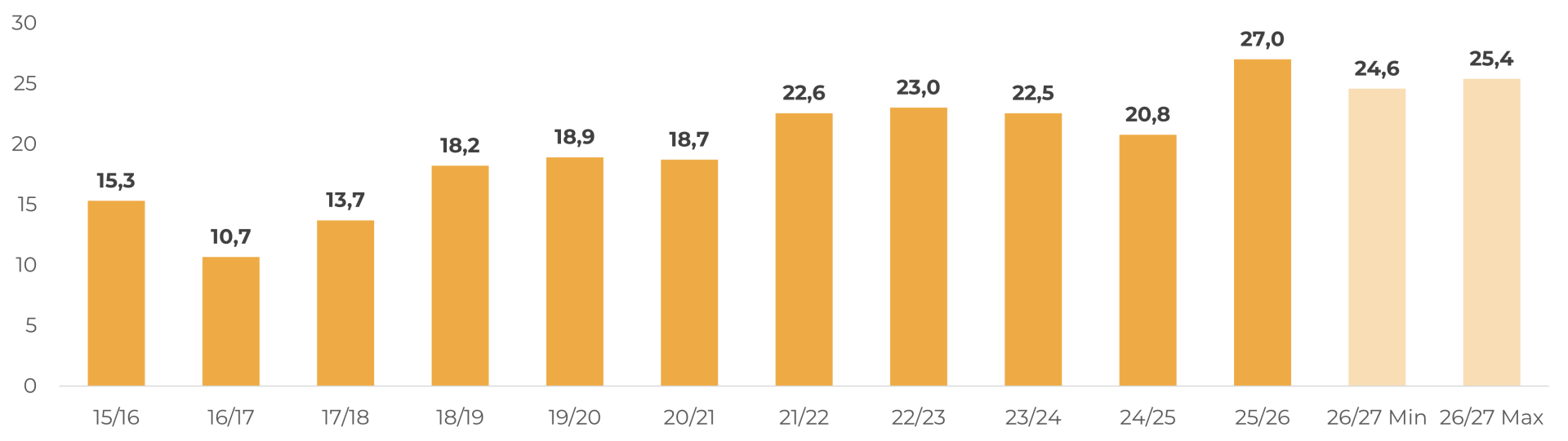 É importante observar, no entanto, que a safra 25/26 apresentou uma produção excepcional. Normalmente, após um ciclo tão forte, os rendimentos diminuem, pois as plantas gastaram grande parte de sua energia. Nesse contexto, previa-se uma queda na produção para 26/27, embora a expansão das áreas cultivadas nos últimos anos tenha compensado parcialmente o declínio esperado. Desde 2023, os preços mais altos do Robusta levaram os cafeicultores a investir em novas áreas e na renovação de áreas antigas, com parte dessas novas áreas entrando em produção neste ciclo.