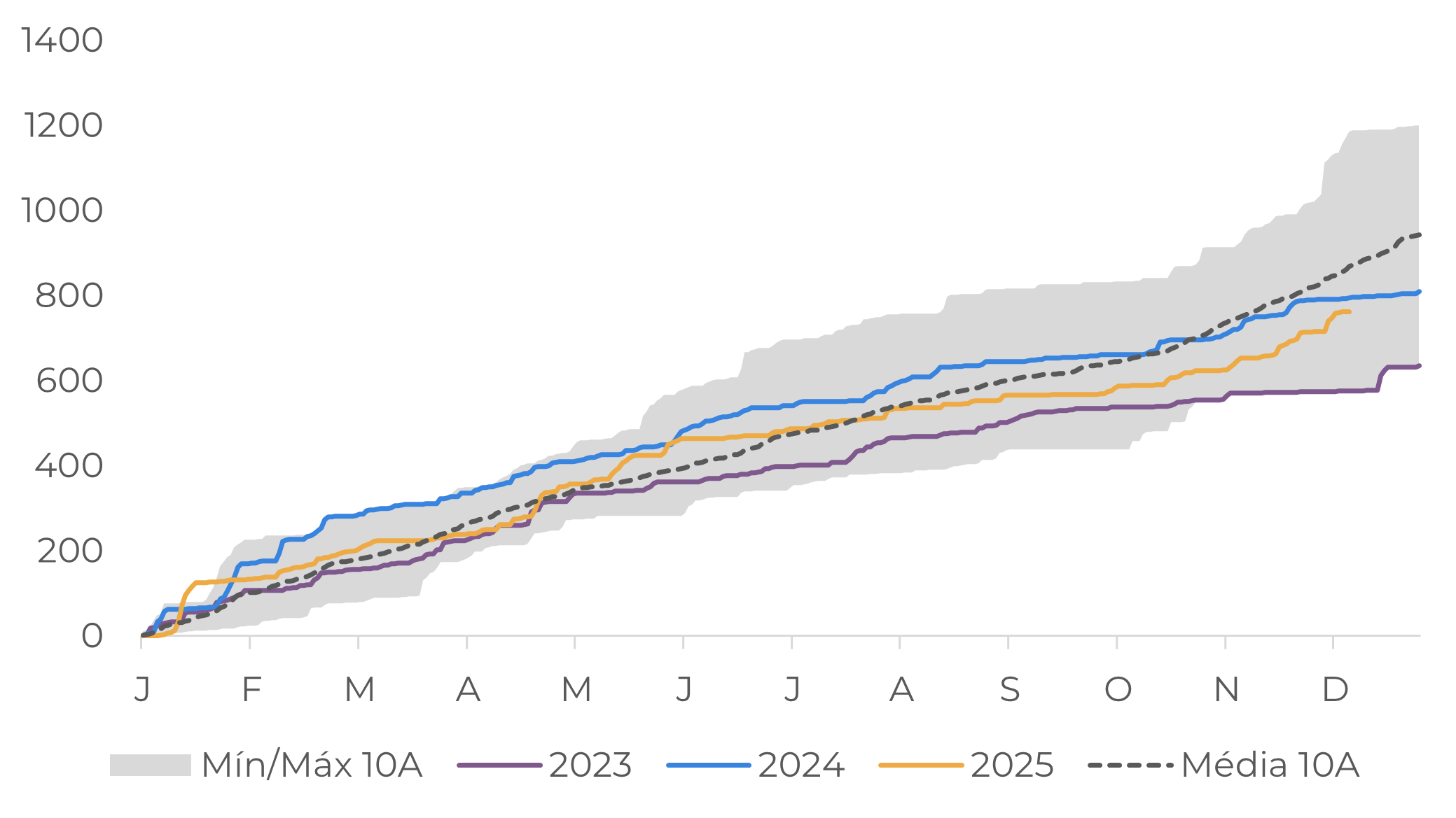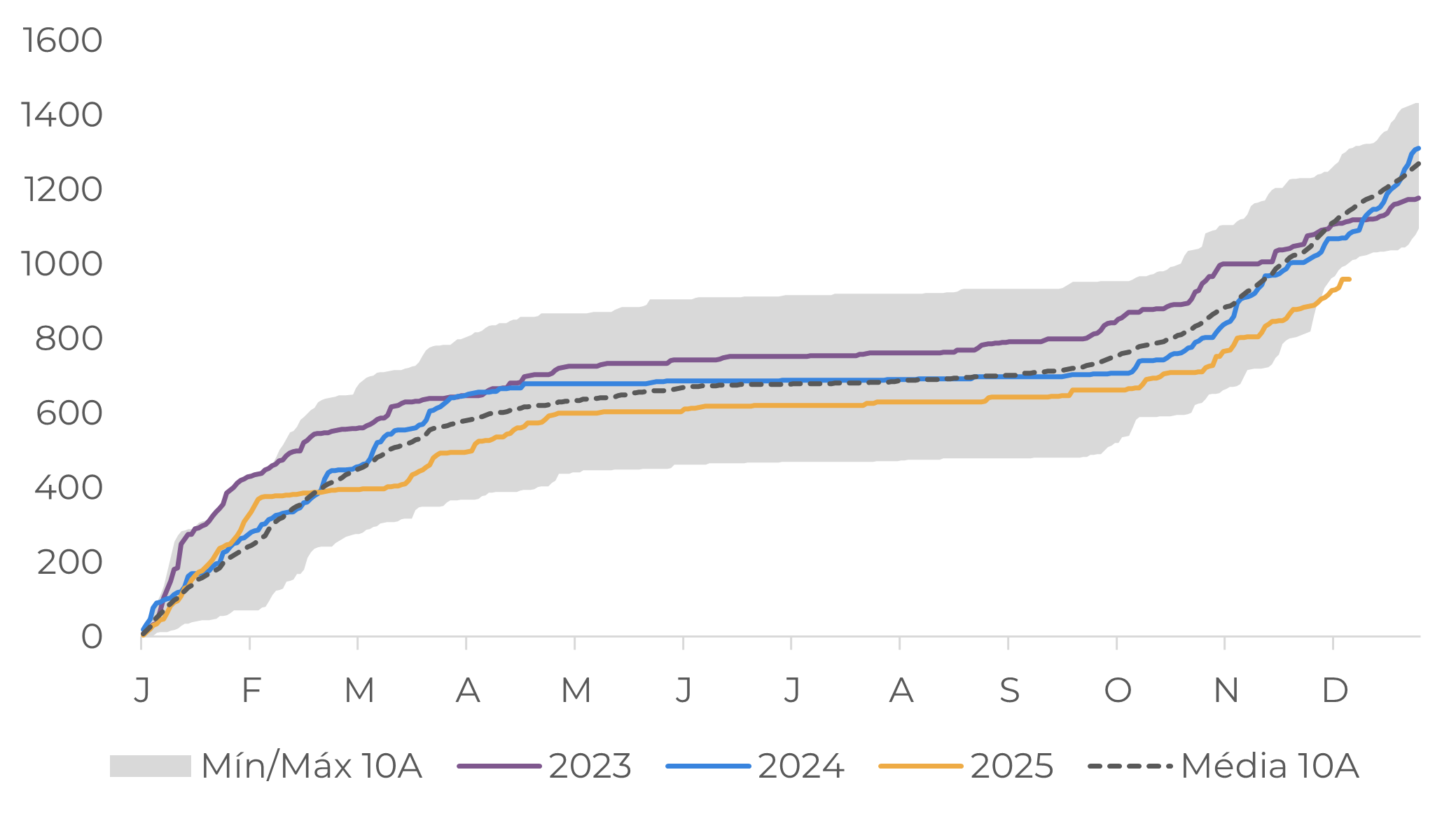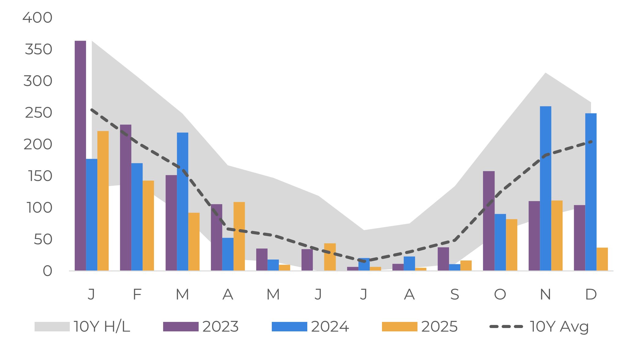 No entanto, conforme mencionado anteriormente, números mais concretos para a safra 26/27 só serão possíveis após a fase de enchimento dos grãos (dezembro a março), quando os rendimentos do processamento poderão ser avaliados adequadamente. Essa incerteza também tende a levar a um contexto de maior volatilidade no mercado. Embora o sentimento esteja atualmente mudando para uma perspectiva mais pessimista, impulsionado pelas expectativas de maior produção brasileira no próximo ano e pela remoção da maioria das tarifas dos EUA sobre o café brasileiro, qualquer adversidade climática pode provocar picos de preços de curto prazo.