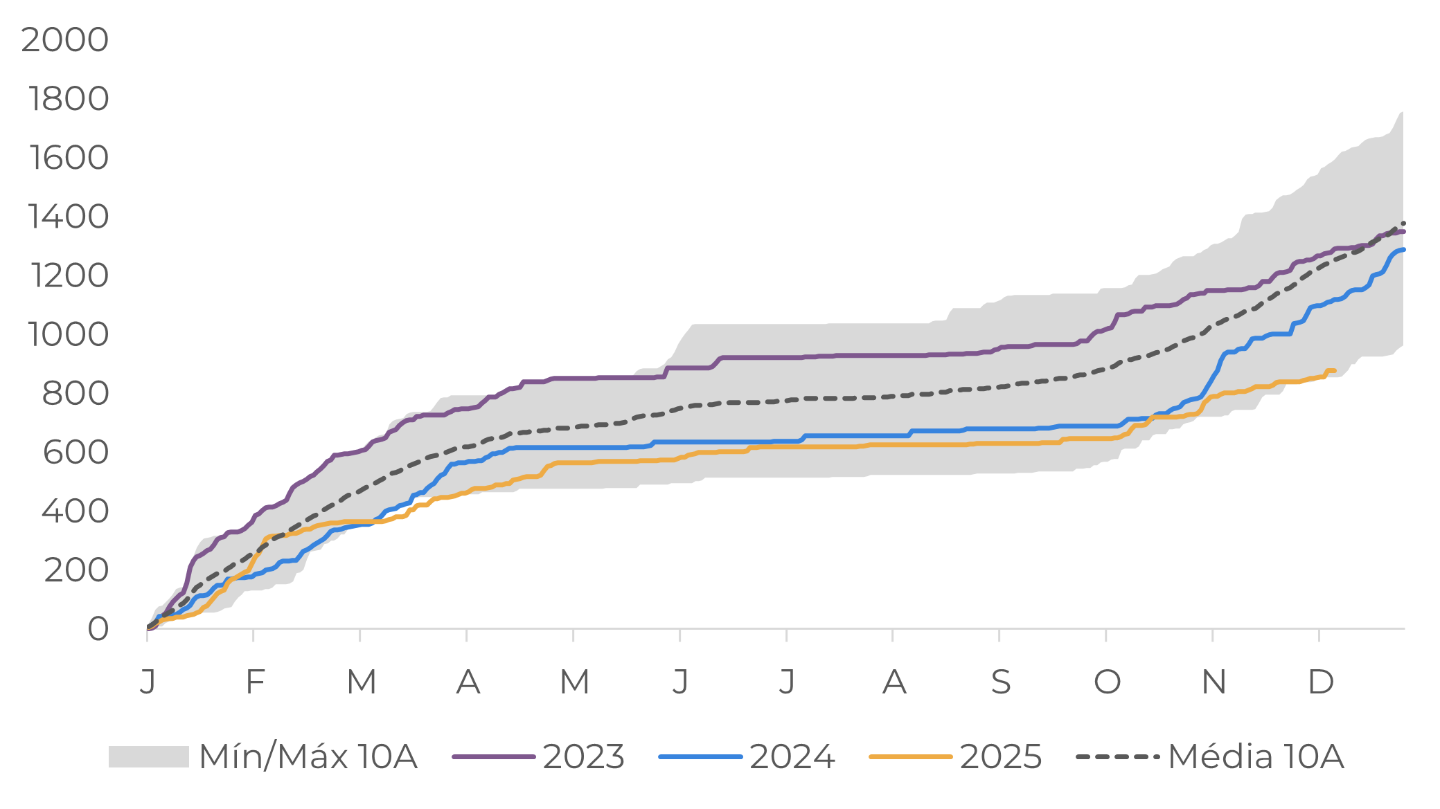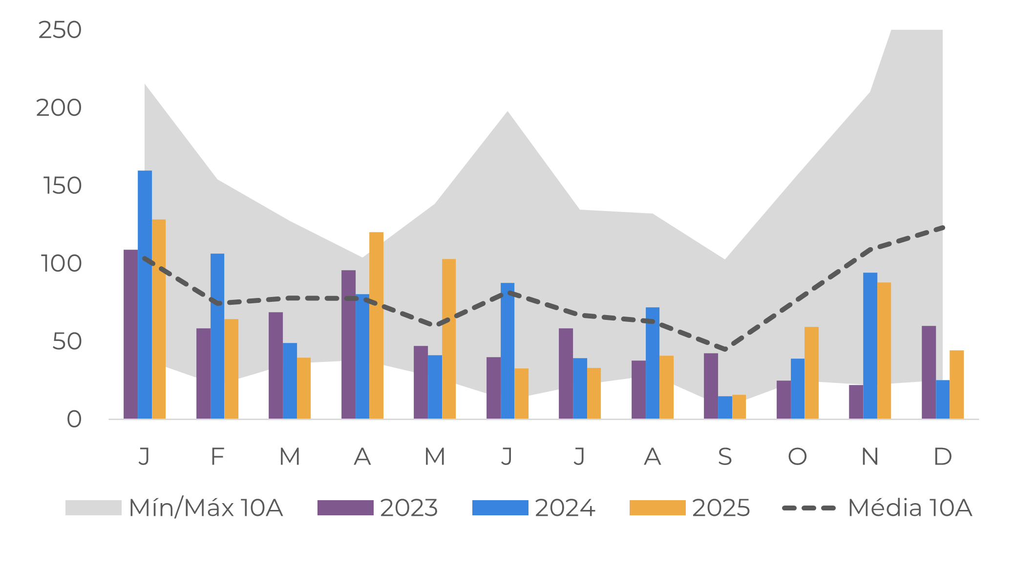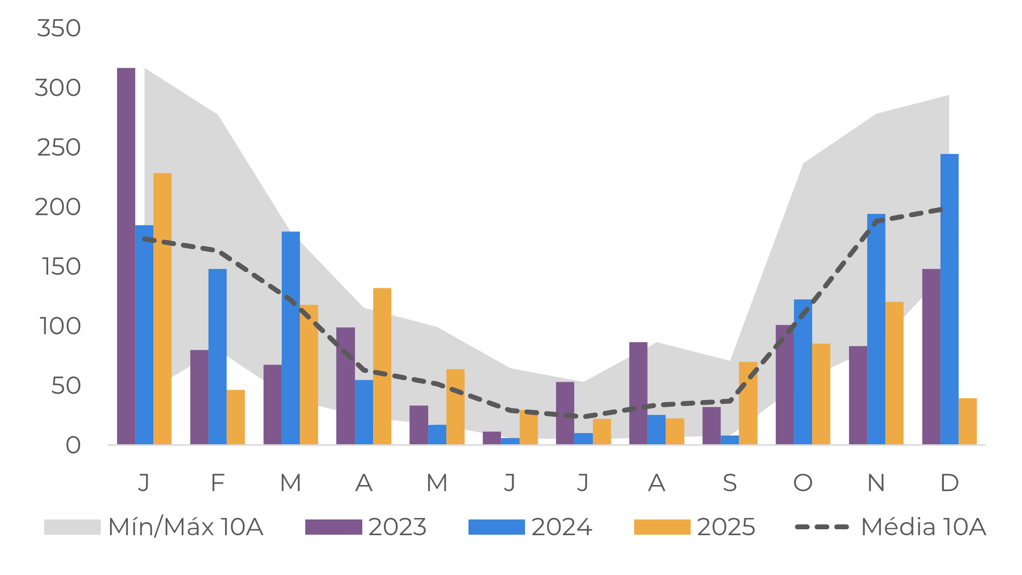 De agosto até o início de outubro, um período de seca no Brasil criou incerteza quanto ao desenvolvimento da safra 26/27, atrasando a fase de floração e causando perdas em parte das primeiras flores em setembro. No entanto, após meados de outubro, chuvas abundantes voltaram às regiões produtoras de café arábica, permitindo uma segunda floração (ou a primeira, em algumas áreas). Ainda que abaixo dos níveis médios, os bons volumes de chuva continuaram até meados de novembro, permitindo a floração e restaurando as expectativas positivas para a safra 26/27.