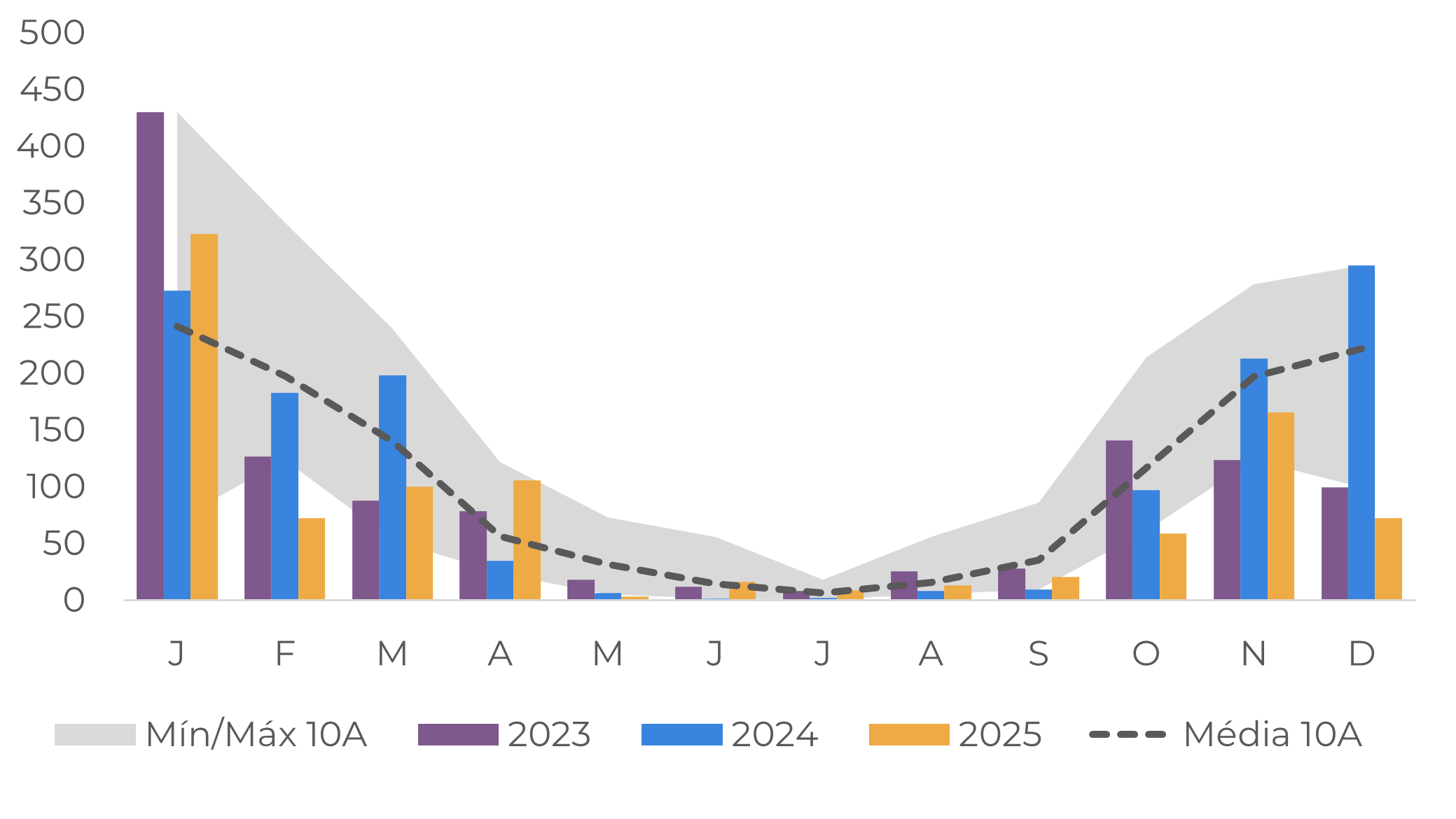 As condições climáticas, especialmente no Espírito Santo e na Bahia, têm sido mais favoráveis para o desenvolvimento da safra de conilon 26/27 desde agosto. Embora as precipitações tenham permanecido abaixo da média, sua consistência, combinada com bons níveis dos reservatórios, favoreceu a floração e o desenvolvimento dos grãos na maioria das regiões, mantendo as expectativas positivas para o próximo ciclo.