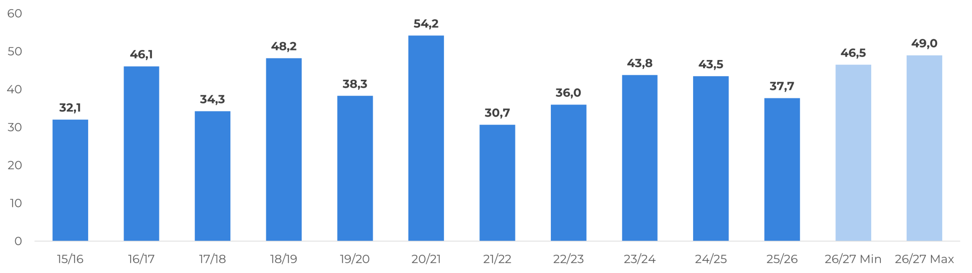 Devido a isso, espera-se que a produção de Conilon alcance cerca de 24,6 a 25,4 M de sacas, uma queda de 6 a 9% em relação aos 27 M de sacas dos níveis de 25/26, mas ainda na faixa alta da produção. Assim como para o Arábica, as áreas de Conilon também estão na fase de enchimento dos grãos e novas revisões em nossos números serão feitas após março.