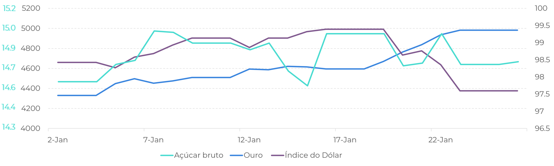 Na quinta-feira, o sentimento de aversão ao risco mudou depois que Trump anunciou a suspensão dos planos de impor novas tarifas à UE e esclareceu que os EUA não usariam a força para adquirir a Groenlândia. Isso foi, de forma geral, favorável às commodities, com exceção do complexo energético, que vinha se beneficiando da incerteza persistente. Os preços do açúcar se recuperaram 1,5% na quinta-feira (22), fechando a semana em um nível mais baixo de 14,7 c/lb na sexta-feira (23).