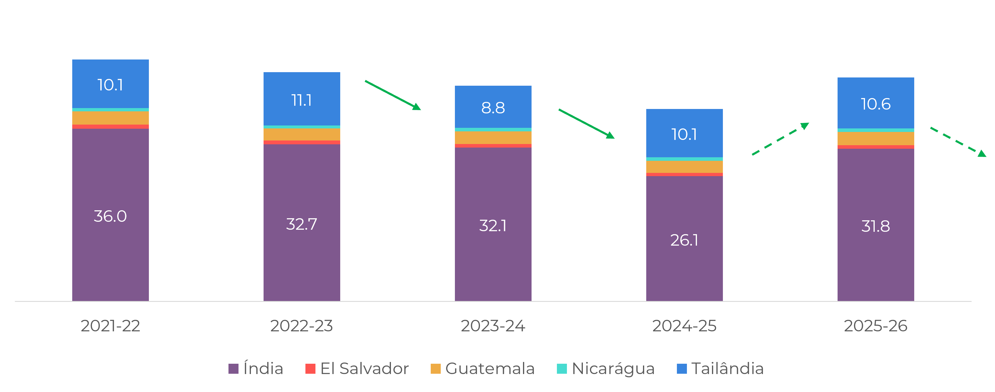 Os resultados do ano seguinte também foram afetados por uma cana já penalizada, combinada com uma redução na área plantada, levando à menor produção líquida de açúcar do país em mais de sete anos, com 26,1 milhões de toneladas. À medida que as condições mudaram para um padrão La Niña, sob o qual as chuvas de monção geralmente aumentam, a safra 25/26 encontrou apoio para seu desenvolvimento da cana.