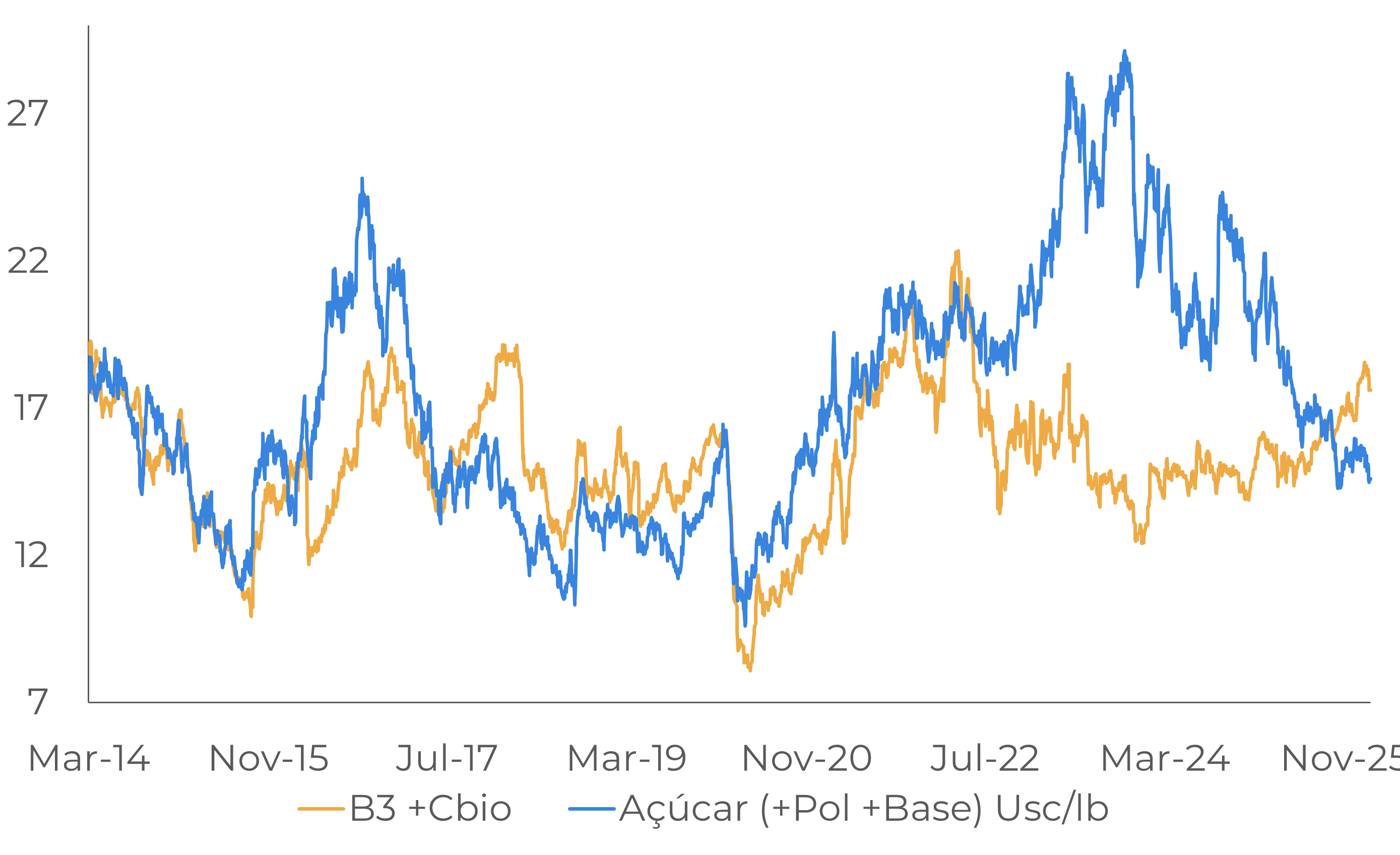 O mecanismo mais econômico para absorver o excedente esperado seria a expansão da demanda por etanol no mercado interno brasileiro — observe que isso não significa uma mudança em nosso crescimento esperado para o Ciclo Otto (2,5% em CS), mas uma alteração na participação da demanda por combustível. Para restaurar a competitividade do etanol hidratado nos postos de gasolina na maioria dos estados, estimamos que os preços ex-mill precisariam cair dos atuais ~R$ 3,0/litro para aproximadamente R$ 2,3/litro (sem impostos). Nesse cenário, o preço mínimo implícito para o açúcar seria próximo a 13,5 c/lb. Em um ano de excedente, os preços devem gravitar em torno desse nível, à medida que o mercado tenta reequilibrar o excesso de disponibilidade de açúcar por meio do consumo de etanol. No entanto, as restrições do mercado físico podem impedir que se atinja um mix de equilíbrio, mantendo algum excesso de oferta e a tendência de baixa ao longo da temporada.