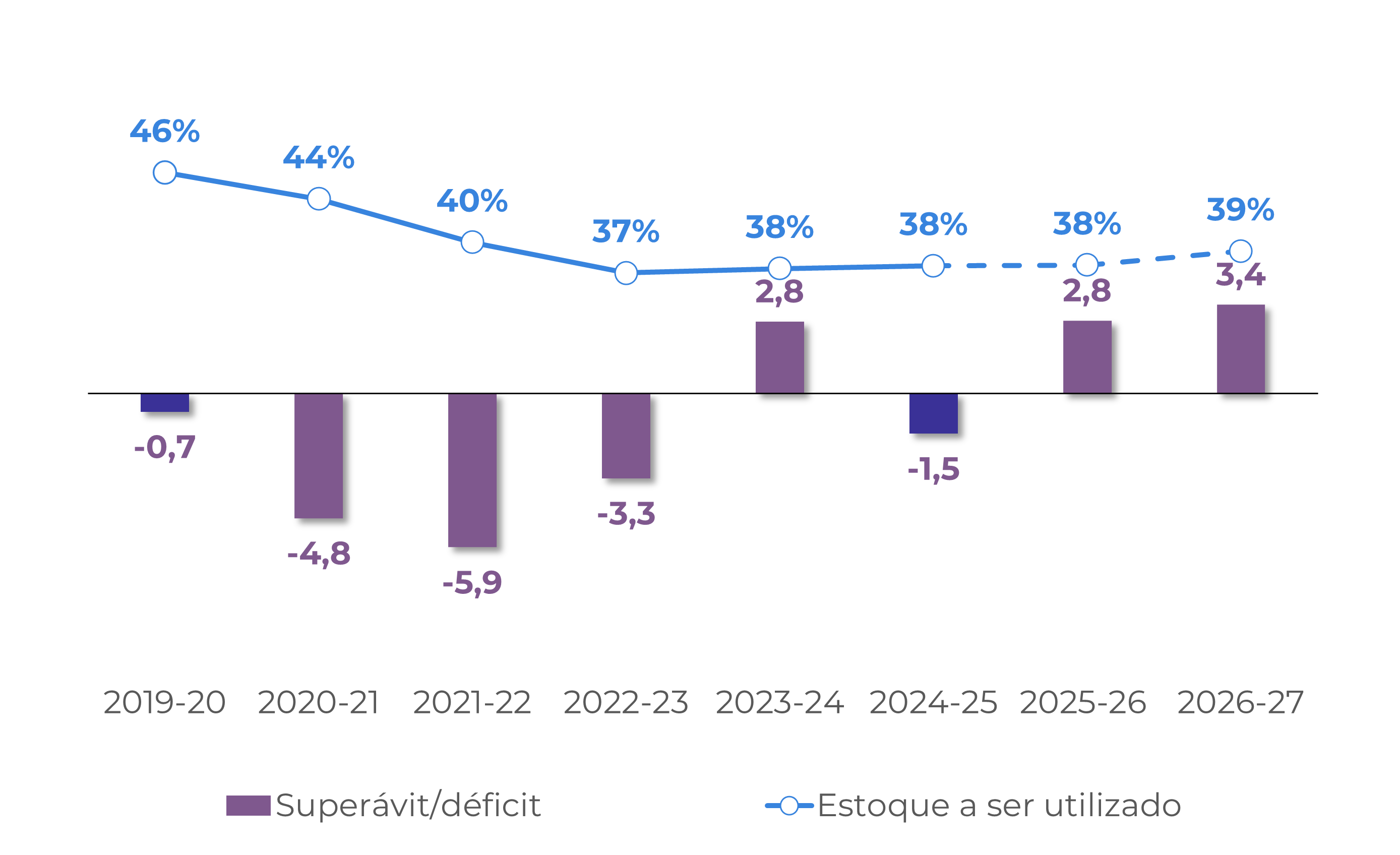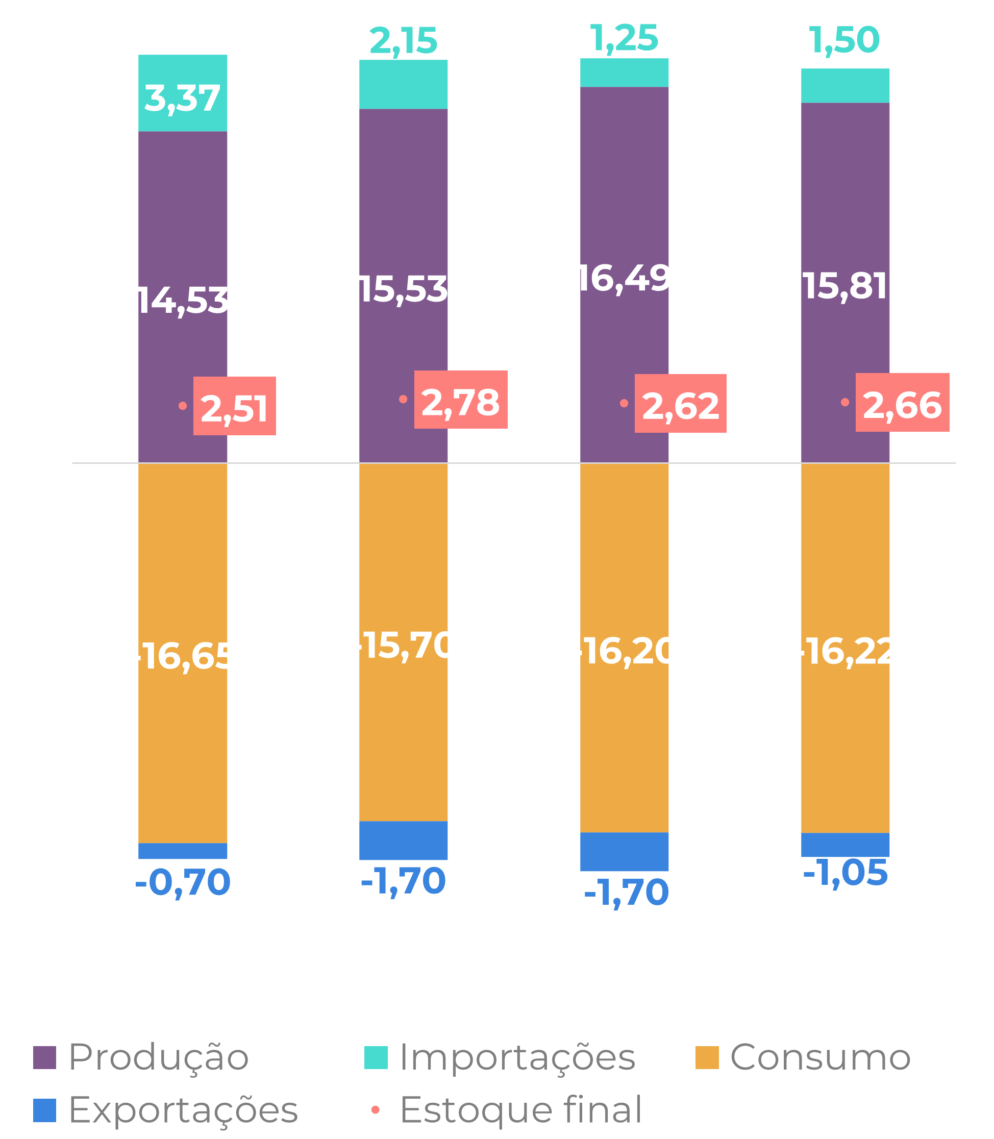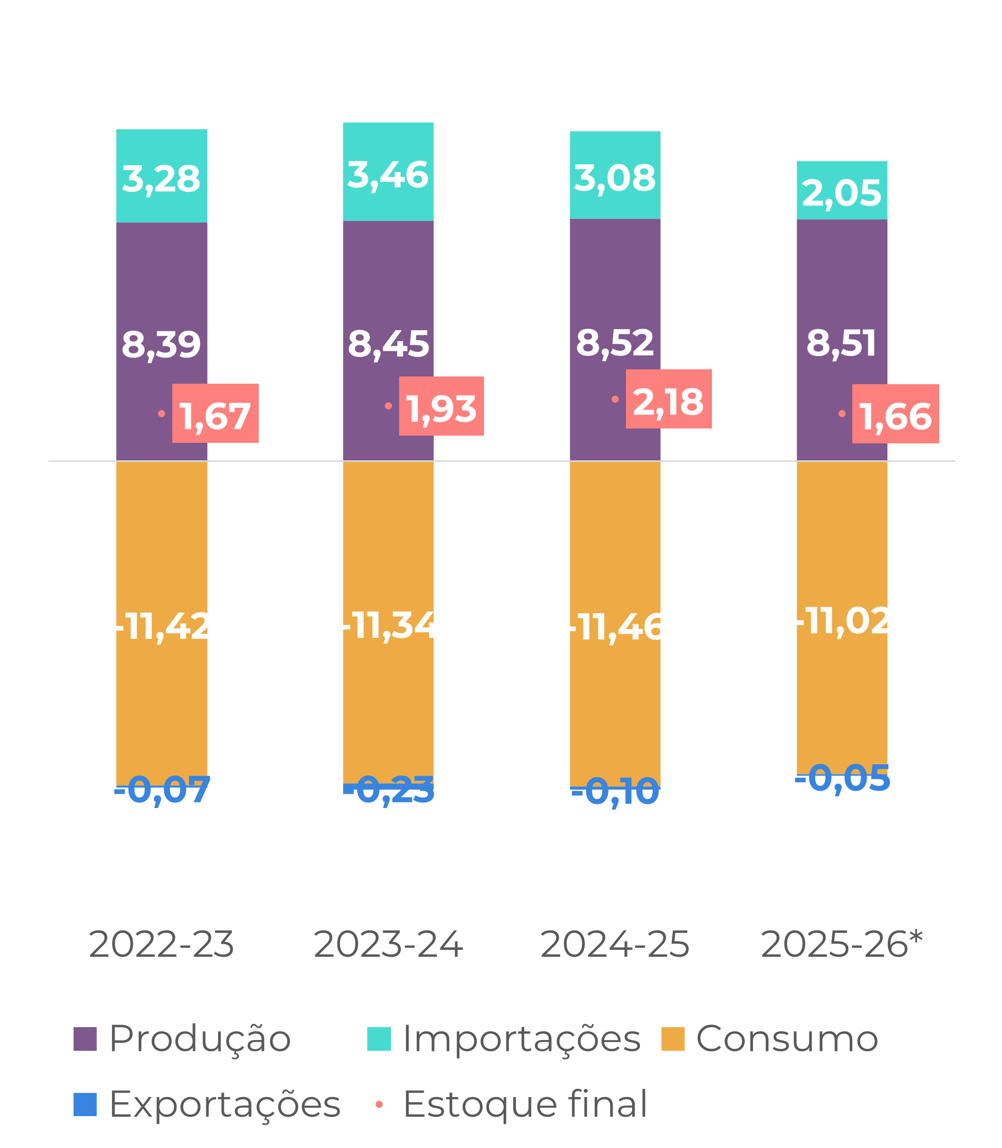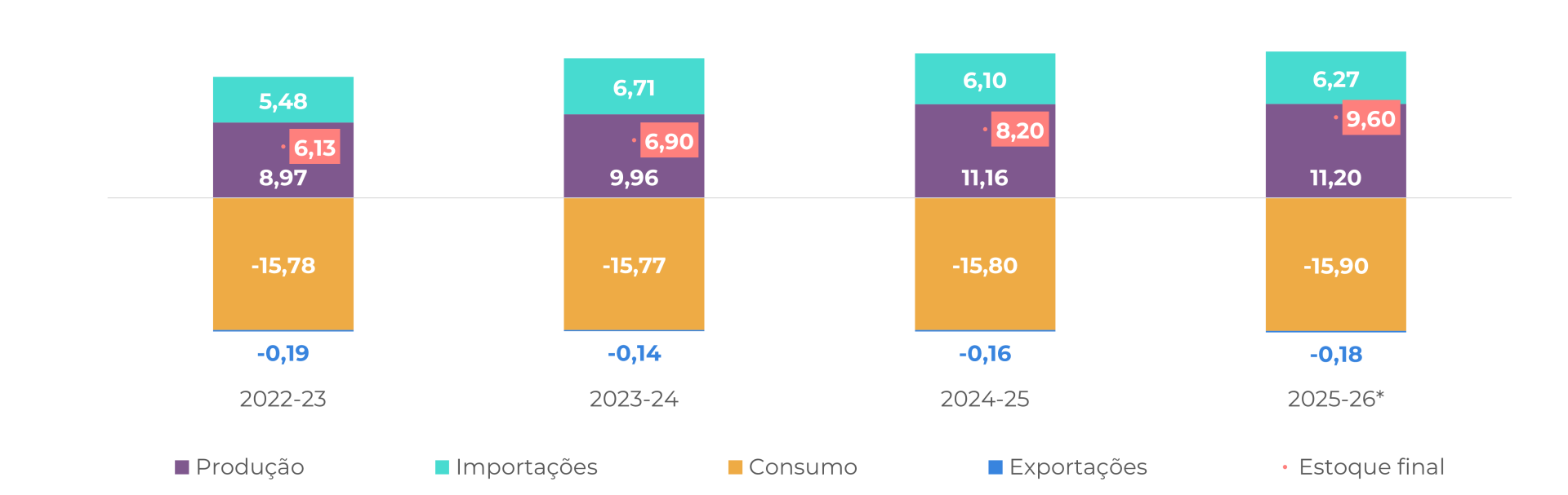Mesmo com essas revisões, a produção total de açúcar dos EUA permanece ligeiramente abaixo da temporada passada. Os estoques elevados permitem que as importações caiam drasticamente para cerca de 2 milhões de toneladas, reduzindo a relação estoque/uso para aproximadamente 14,5%.