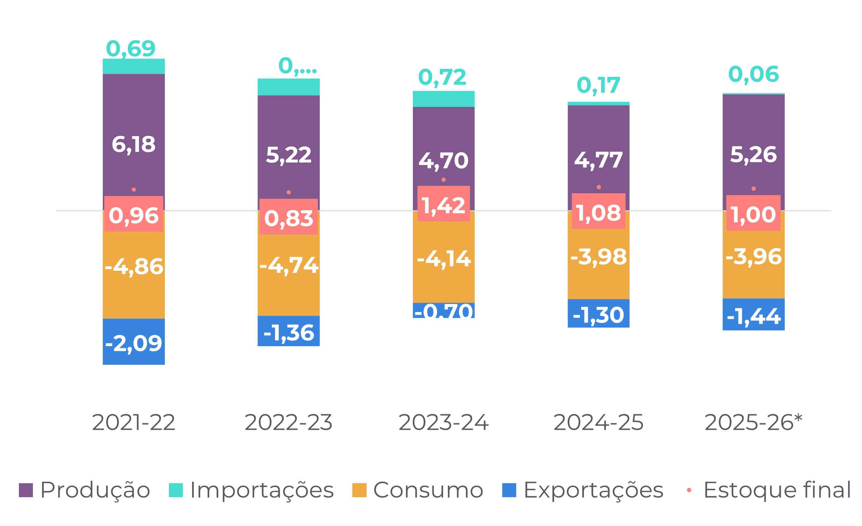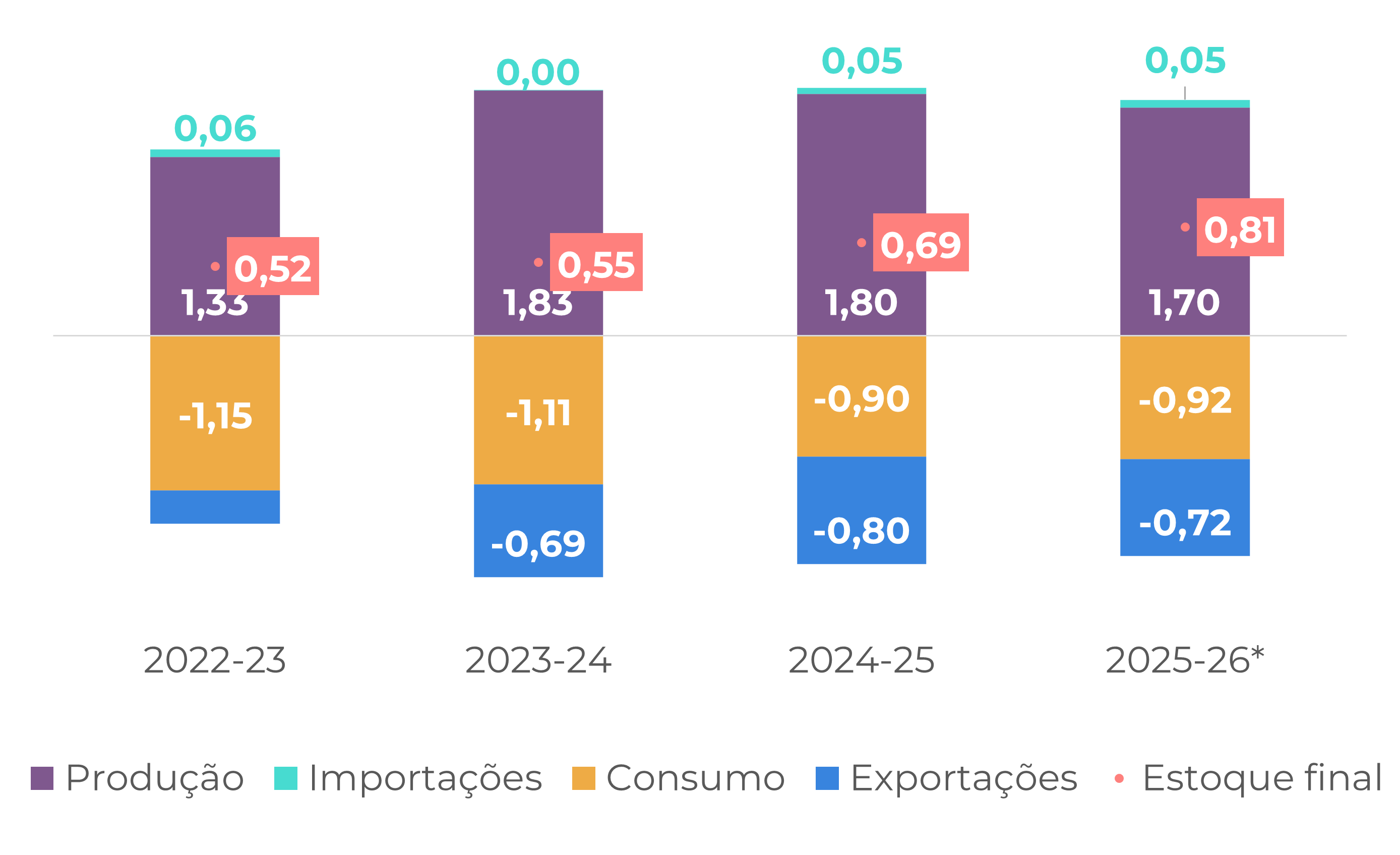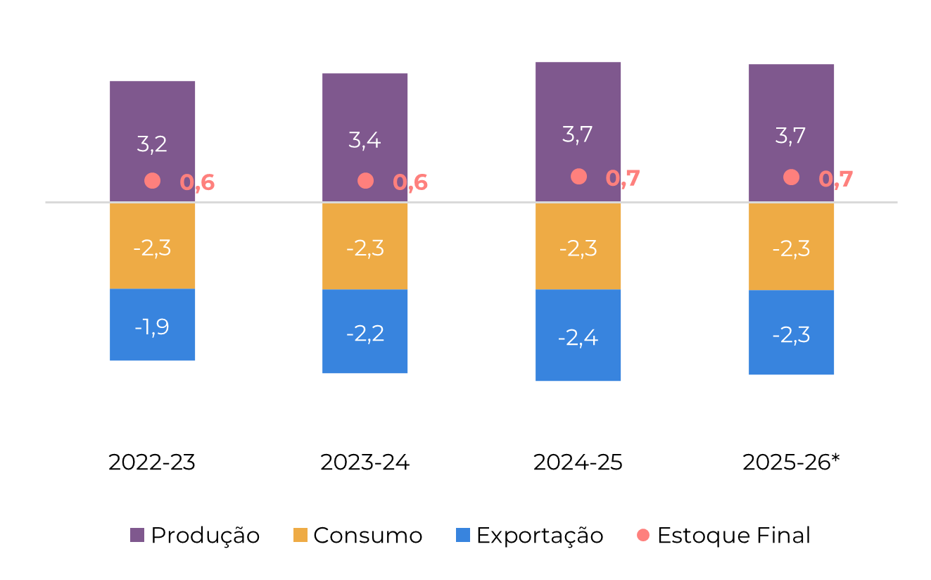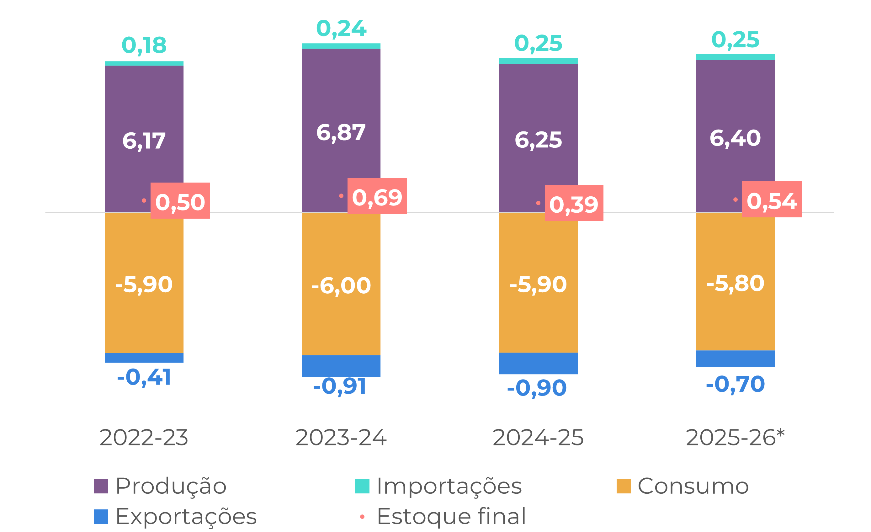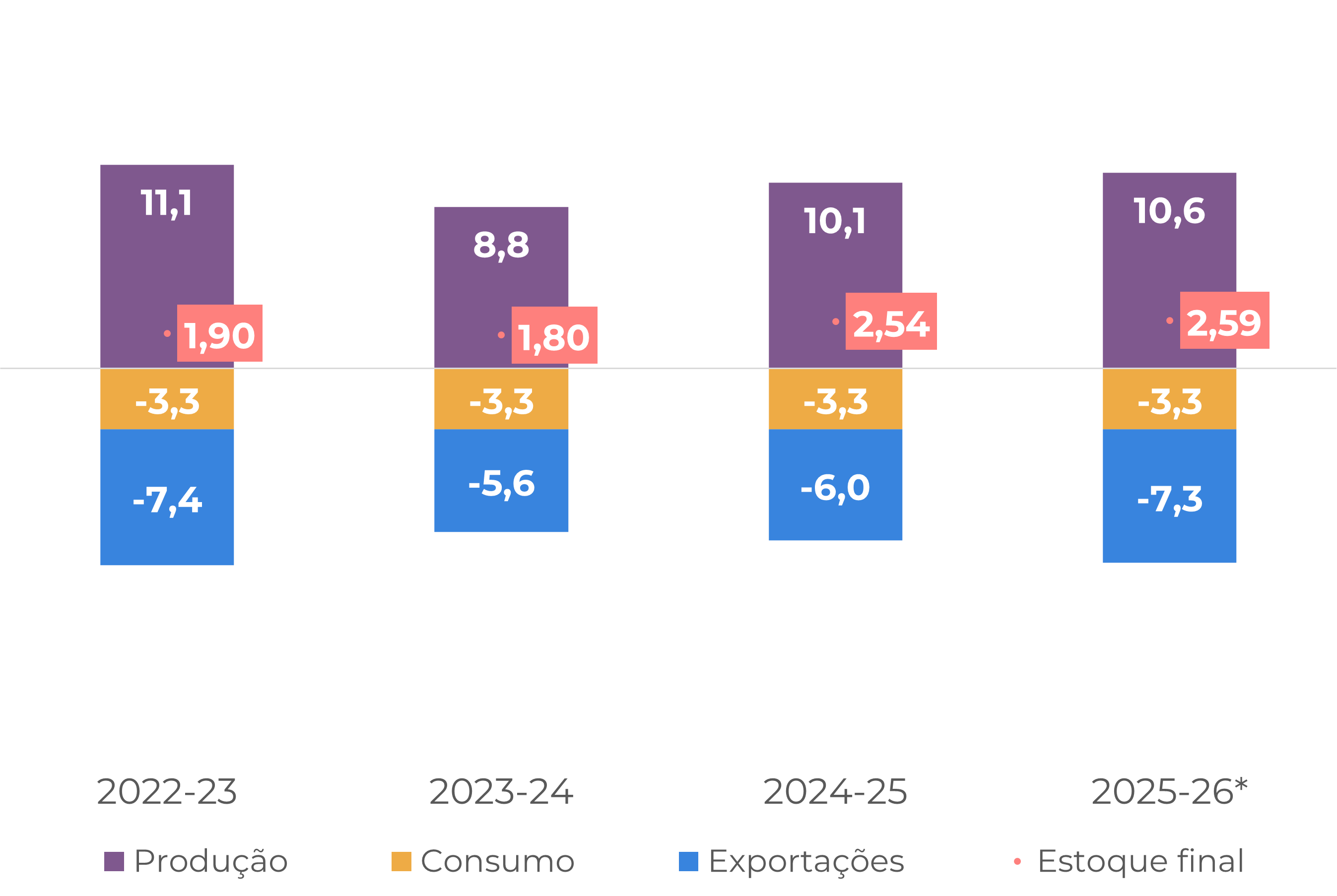 Espera-se que o equilíbrio global de outubro a setembro de 2025/26 permaneça em excedente. O Brasil continua ancorando a disponibilidade global, enquanto as recuperações na Índia, Tailândia e México adicionam oferta incremental. O crescimento da demanda continua insuficiente para absorver esses volumes, particularmente no contexto de incerteza econômica nas principais regiões consumidoras. Como resultado, os fluxos comerciais após a entressafra brasileira continuam sinalizando um excesso de oferta.