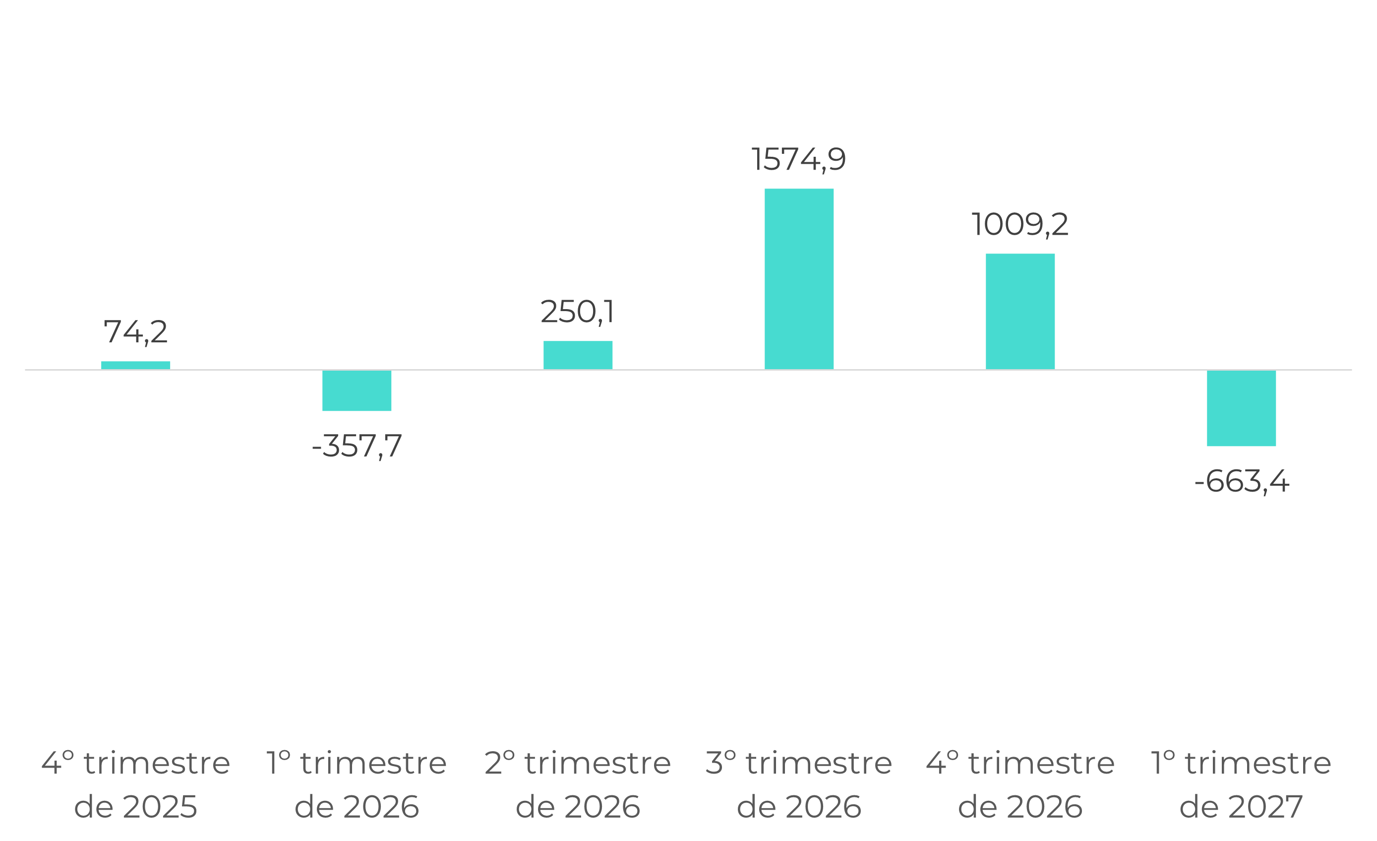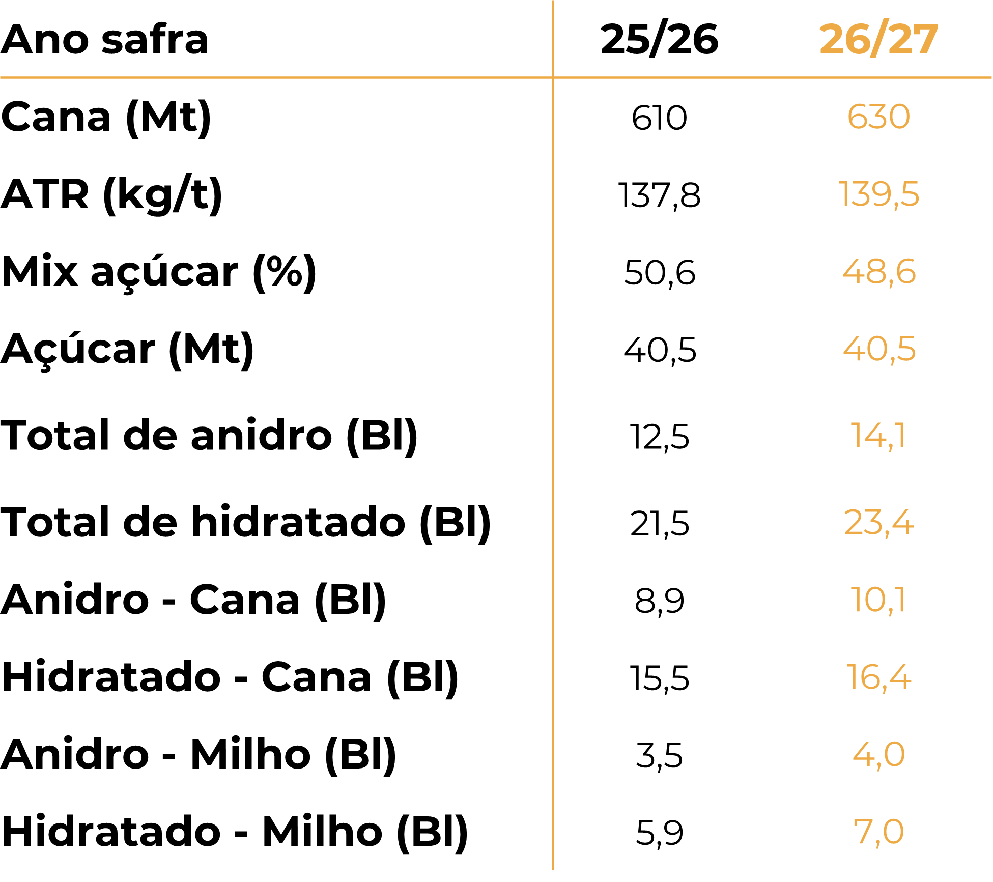 O foco do mercado está se voltando cada vez mais para a safra 2026/27. Modelos preliminares, com base nos números realizados até novembro, sugerem que a moagem de cana pode se aproximar de 630 Mt, em grande parte apoiada por uma recuperação no TCH após a melhora nas chuvas. O mix açúcar continua sendo a principal incerteza. Nesta fase, estimamos um mix em torno de 48,6%, o que implica uma produção de açúcar próxima a 40,5 Mt, com revisões prováveis à medida que os dados da janela de desenvolvimento de outubro a fevereiro forem disponibilizados. Observe que esse mix não resolverá totalmente o excedente global. Restrições físicas e comerciais — notadamente volumes de açúcar pré-vendidos e com hedge, e o ajuste não linear da demanda por combustível — limitam a flexibilidade de queda do mix, impedindo um movimento em direção a ~46,2%, o nível de equilíbrio estimado.