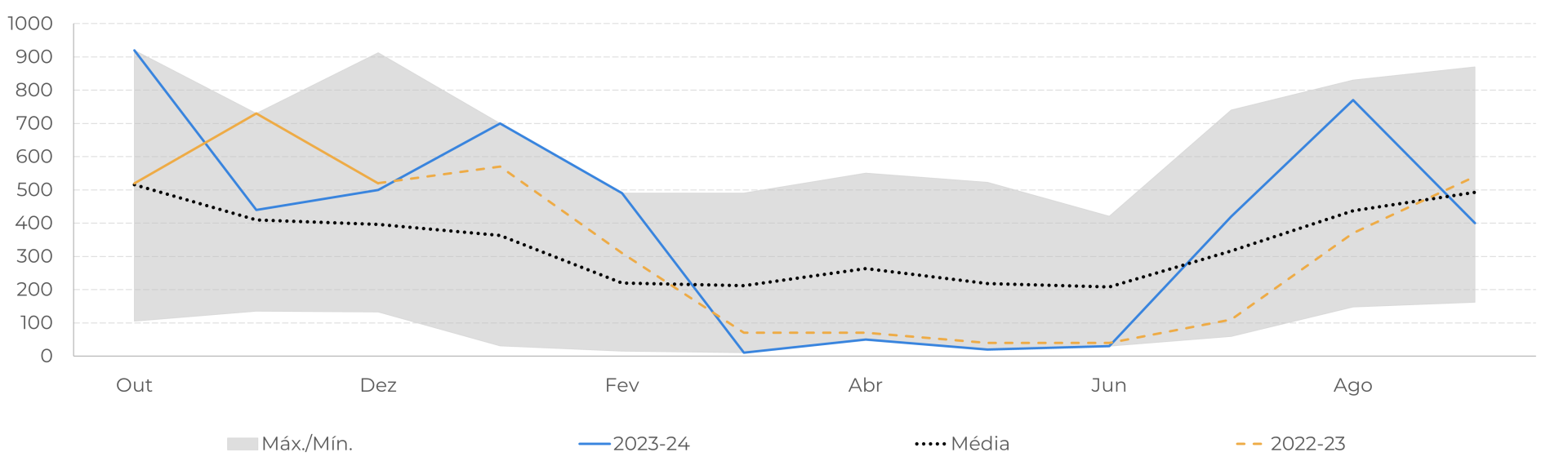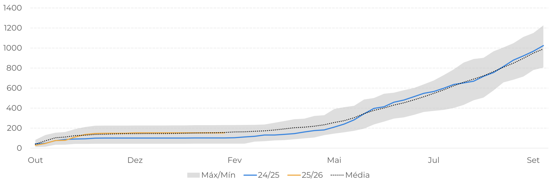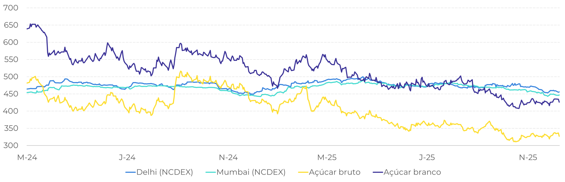 Em relação às exportações, o governo autorizou 1,5 Mt. No entanto, os preços internacionais atuais continuam pouco atraentes, com a paridade de exportação perto de 18,5 c/lb para o açúcar bruto e cerca de US$ 450/t para o açúcar branco. Como resultado, novos acordos de exportação provavelmente serão adiados. Qualquer aumento no preço mínimo de venda (MSP) fortaleceria ainda mais os preços internos e restringiria os fluxos de exportação nas condições globais atuais.