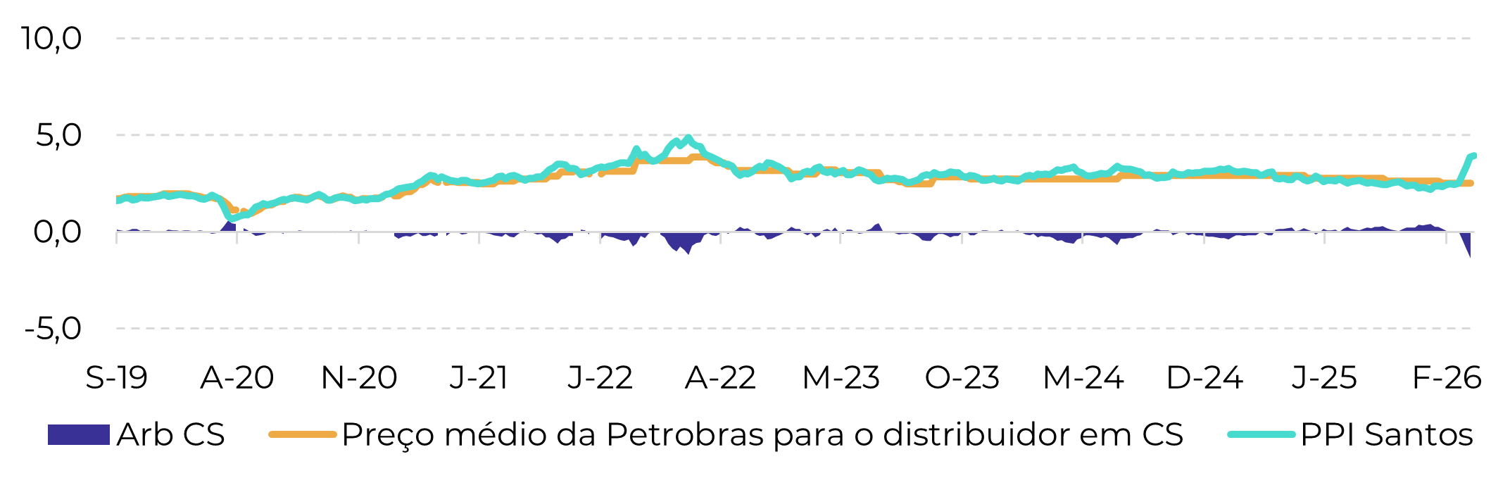 Arbitragem média de importação da Petrobras na região Centro-Sul (BRL/litro)