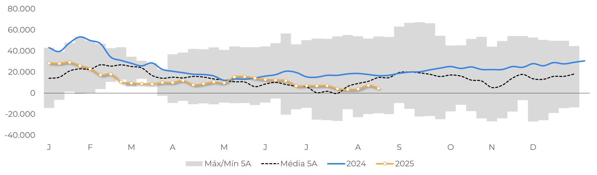 - Em Nova York, os especuladores voltaram a reduzir suas posições compradas, mantendo o saldo líquido próximo da neutralidade e ainda abaixo dos patamares históricos, o que reforça a percepção de cautela no mercado.