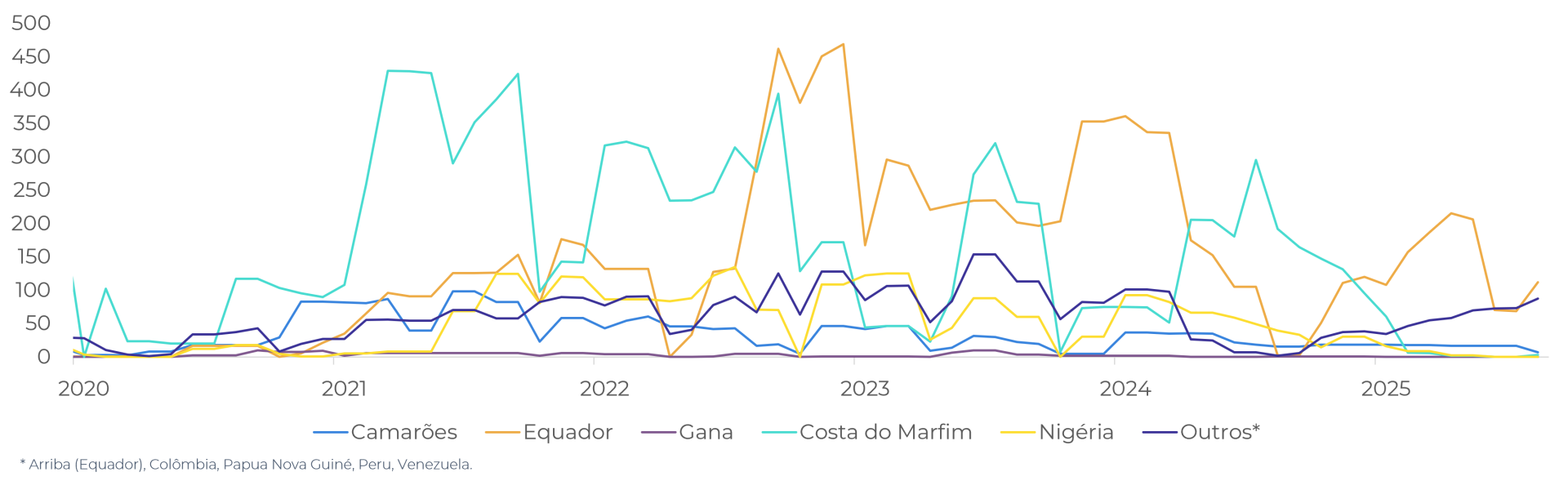 Ainda sobre o Equador, o país ganhou destaque em um ponto que o mercado acompanha de perto: a possibilidade de um acordo tarifário com os Estados Unidos. Atualmente, as exportações de cacau equatoriano para o mercado norte-americano estão sujeitas a uma tarifa de 15%, mas há rumores de negociações em andamento para isentar o produto. Isso reforça a tendência de crescimento das compras norte-americanas de cacau equatoriano, que já vêm superando os volumes do ano passado.