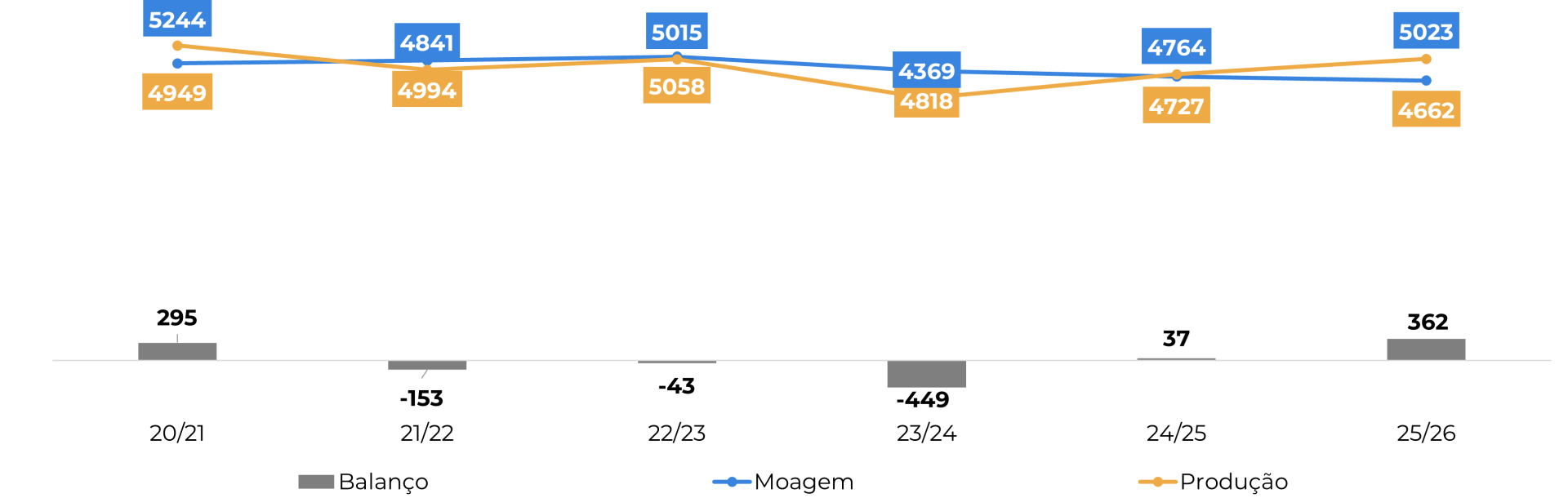 - As perspectivas para a safra 2025/26 indicam possibilidade de superávit de cerca de 360 mil toneladas, condicionado a um regime hídrico equilibrado na África Ocidental.