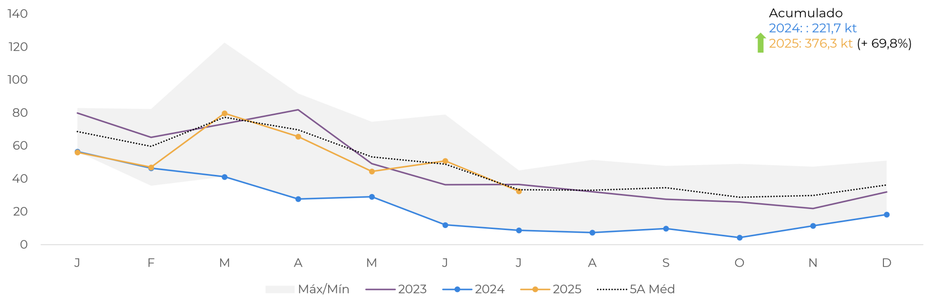 - Na União Europeia, as importações líquidas acumulam queda próxima de 5% em relação a 2024, reflexo de custos de aquisição mais elevados.