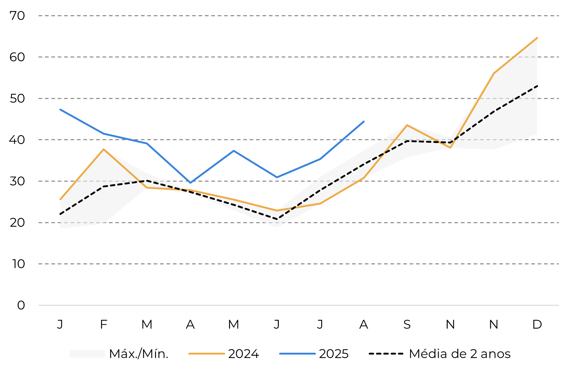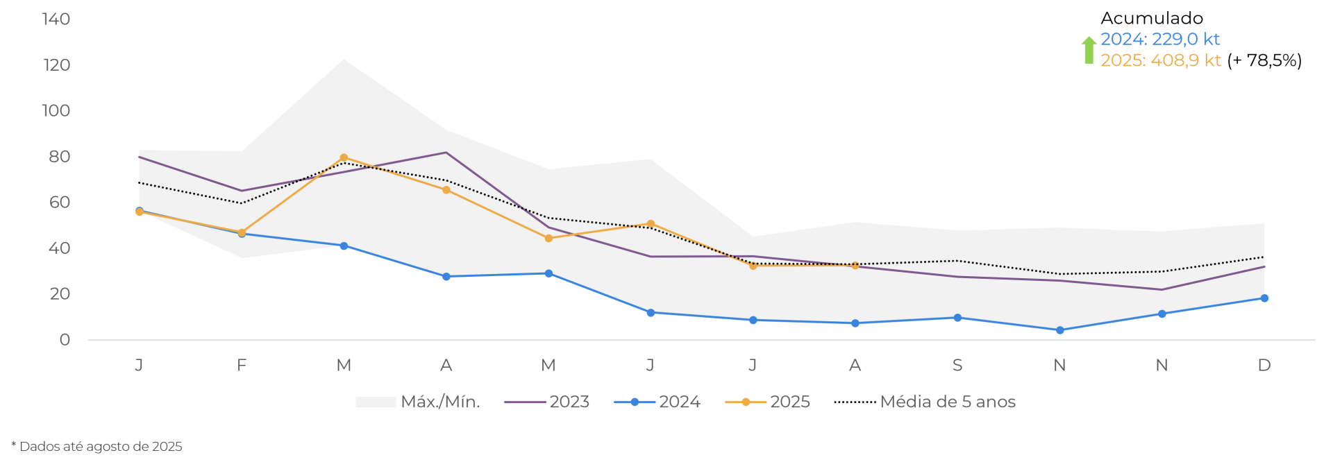 No que diz respeito à demanda, os Estados Unidos seguem apresentando um quadro mais resiliente. As importações líquidas de cacau voltaram a crescer em agosto após o período de interrupção de dados durante o shutdown, permanecendo próximas da média histórica. No acumulado do ano até agosto, os volumes cresceram de forma expressiva em relação a 2024, impulsionados principalmente pela importação de amêndoas, sinalizando manutenção de uma demanda mais firme na América do Norte.