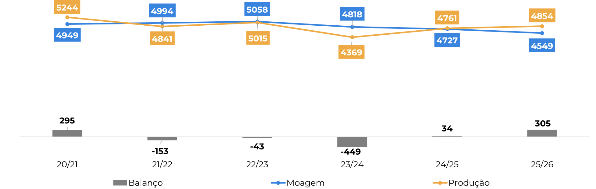 - A combinação entre recomposição parcial da produção em origens relevantes, desaceleração da moagem na Europa e na Ásia e maior resiliência da demanda nos Estados Unidos sustenta a expectativa de superávit para a safra 25/26 e explica a tendência recente de correção nos preços.