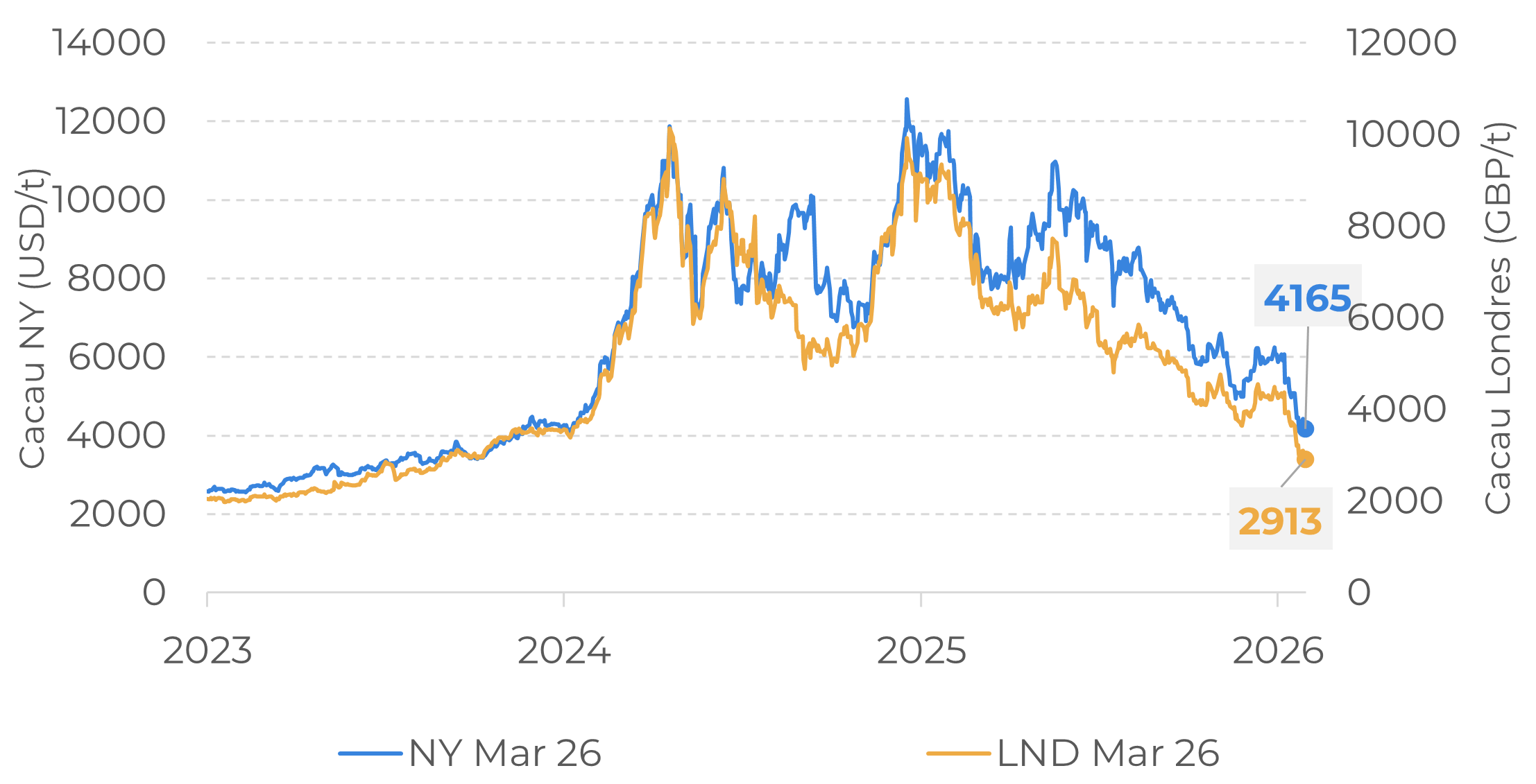 Nesse contexto, além dos resultados de moagem das principais regiões processadoras terem indicado nova retração no último trimestre de 2025, o mercado permanece atento à divulgação dos resultados financeiros dos principais processadores e fabricantes de chocolate, alguns dos quais serão divulgados na próxima semana, com foco especial no comportamento dos volumes vendidos. Empresas com maior exposição ao mercado norte-americano podem apresentar desempenho relativamente mais favorável nesse indicador, caso acompanhem o padrão observado na região, onde a moagem registrou leve avanço, em contraste com a retração observada na Ásia e na Europa. Esse conjunto de fatores tende a manter o mercado mais sensível no curto prazo, especialmente considerando que os indicadores técnicos, como o RSI, permanecem em território de sobrevenda.