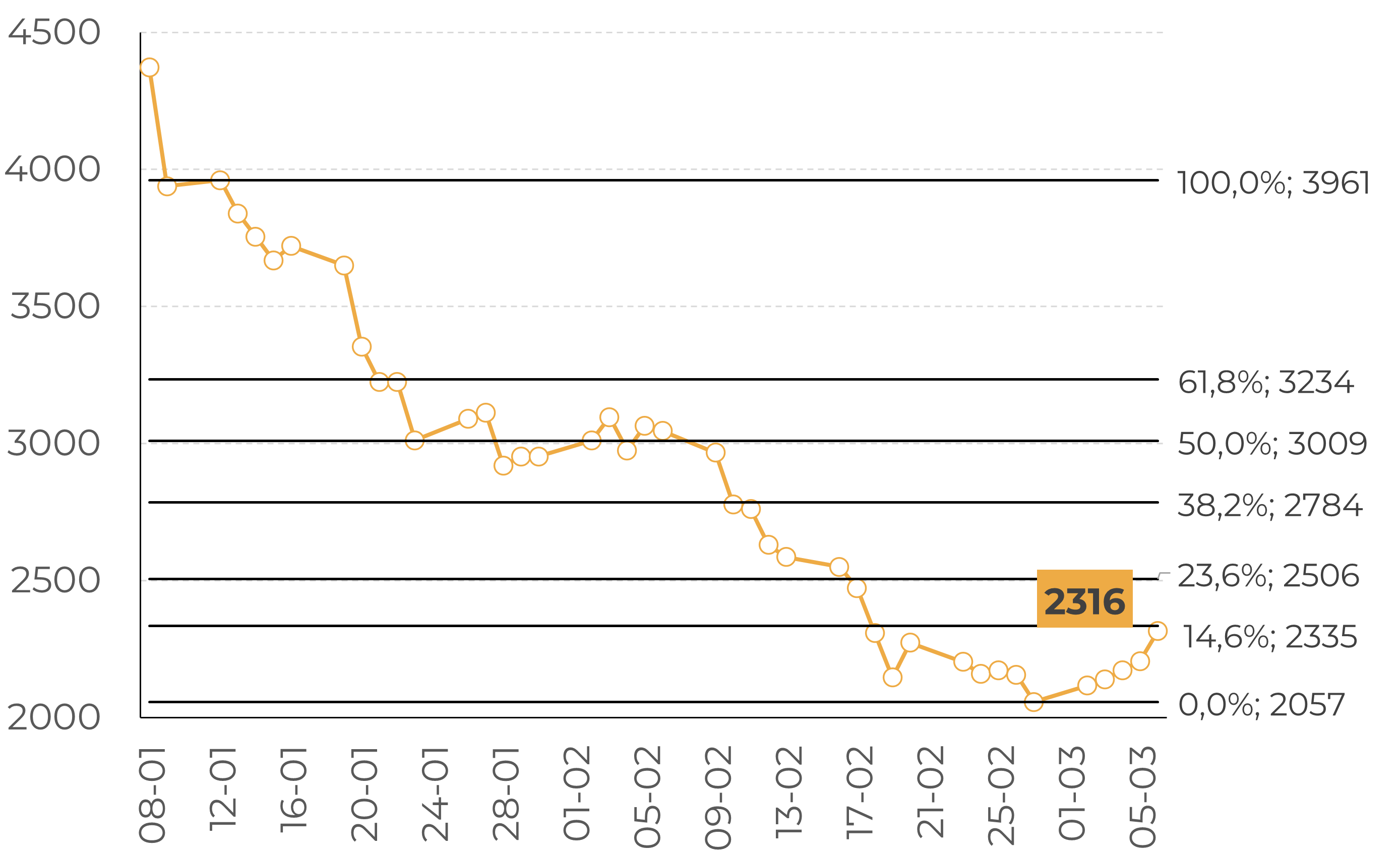 Cacau – Nova York Mai 26: Retração de Fibonacci (USD/t)