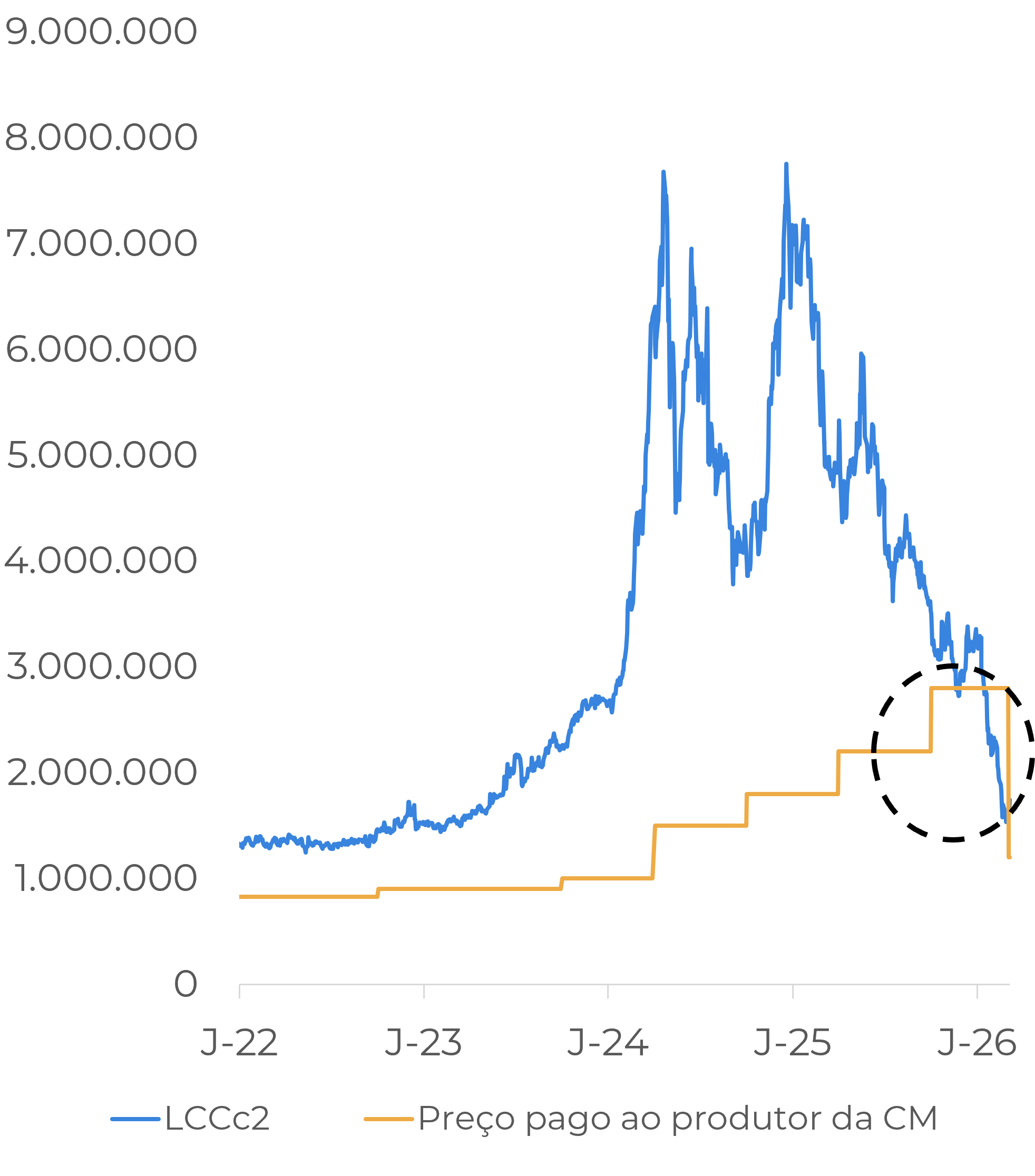 Mesmo com esse comportamento relativamente mais resiliente nos Estados Unidos, a demanda global ainda poderá permanecer pressionada ao longo do restante da safra 25/26 e possivelmente também no início do ciclo seguinte. Uma parcela relevante da indústria adquiriu cacau a preços historicamente elevados, o que continua sustentando os custos de produção e mantendo os preços ao consumidor em níveis altos. Esse ambiente também levou a ajustes nos portfólios e reformulações de produtos adotadas pela indústria como forma de adaptação ao cenário de preços elevados.