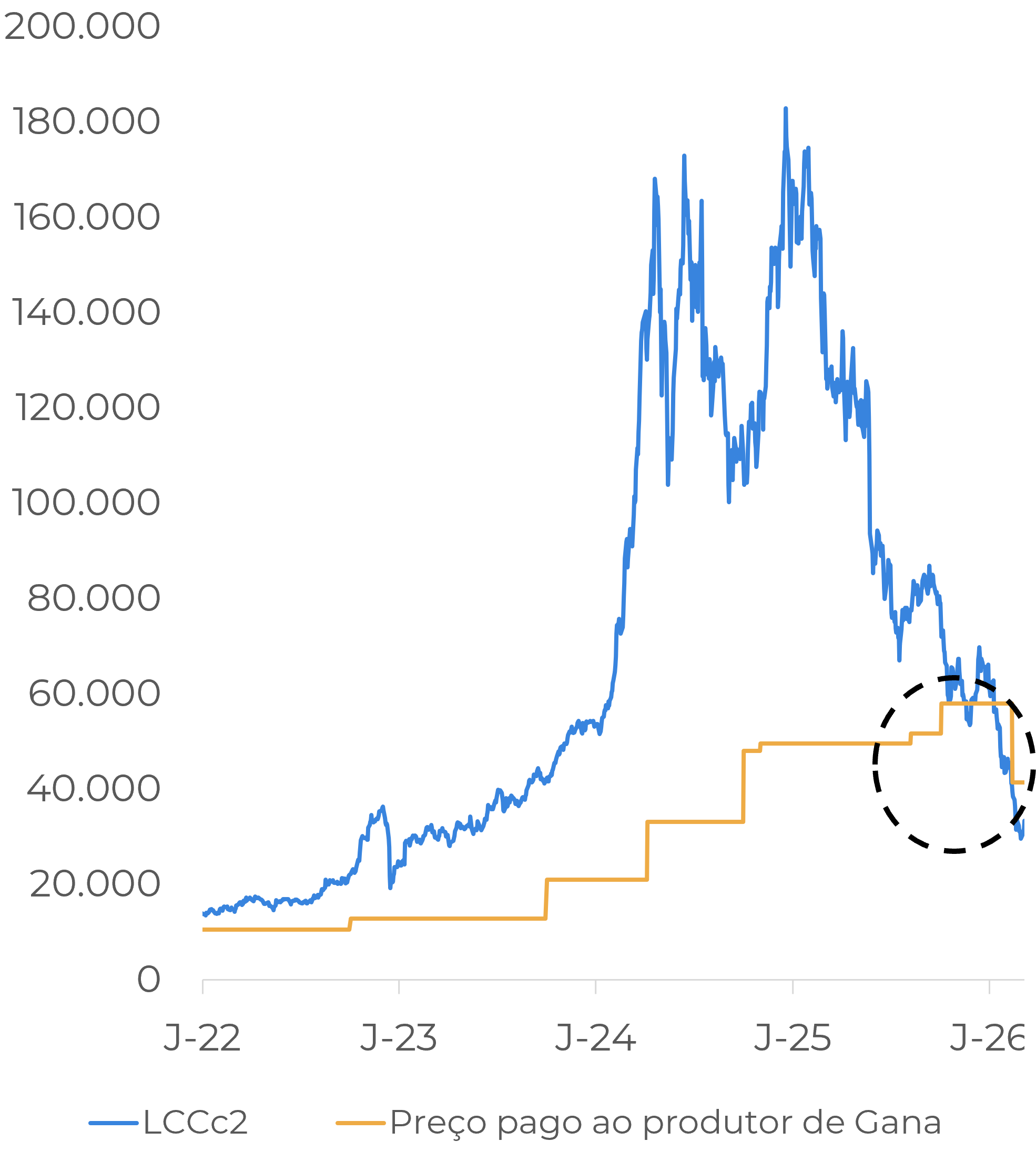 O preço pago ao produtor tem sido um fator importante para entender os recentes problemas nos fluxos comerciais de Costa do Marfim e Gana. Com a queda das cotações internacionais, os preços internos definidos pelos reguladores em ambos os países chegaram a ficar acima dos níveis de mercado, o que gerou dificuldades nas comercializações e afetou o ritmo das exportações. Durante o Hedgepoint Outlook 2026, nossa expectativa era de que a Costa do Marfim realizasse um corte no preço pago ao produtor, movimento que acabou sendo confirmado nesta semana. Na quarta-feira, 04 de março, o país anunciou uma redução de cerca de 57%, para 1.200 francos CFA por kg. Gana já havia realizado um ajuste semelhante anteriormente.