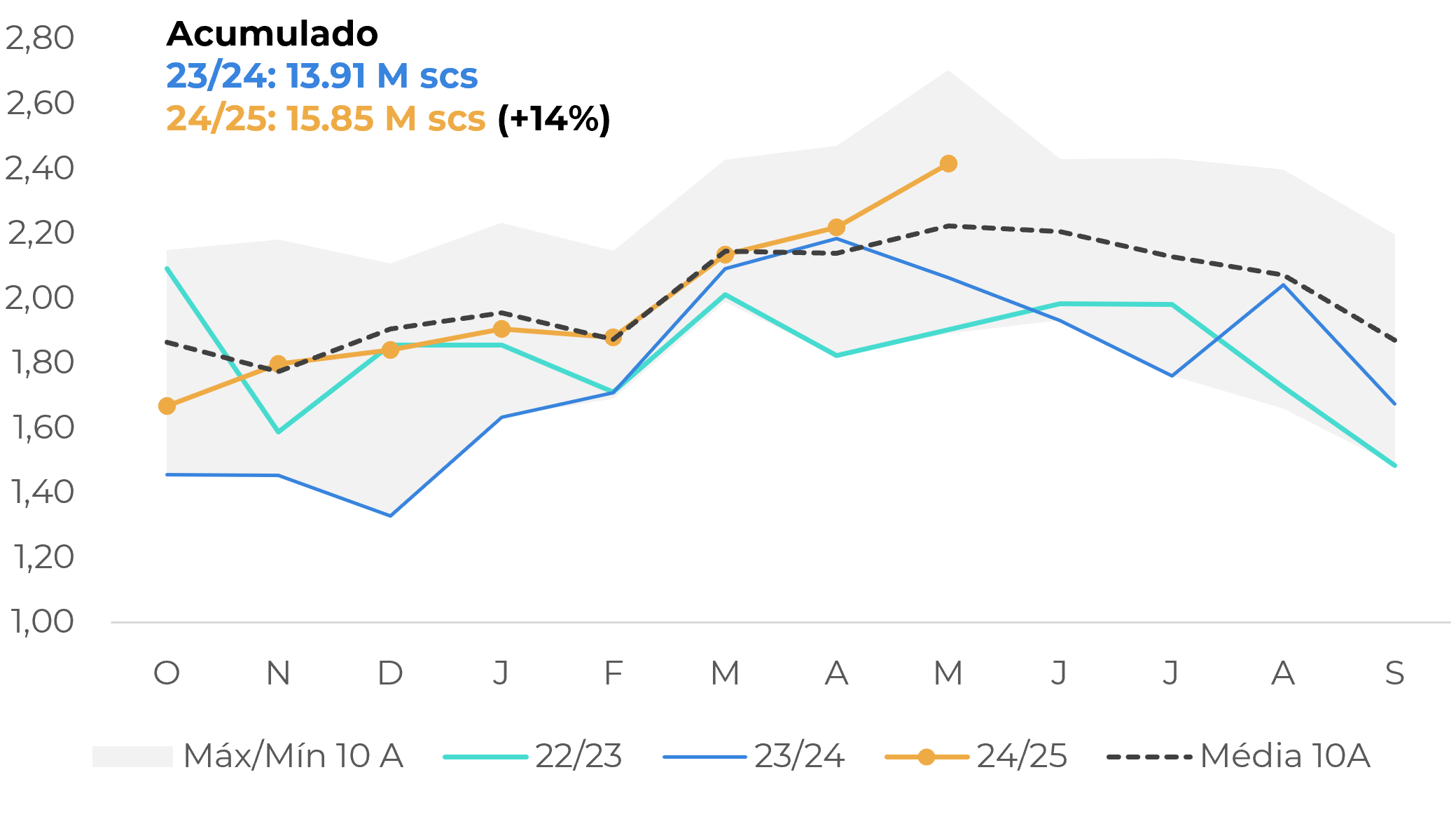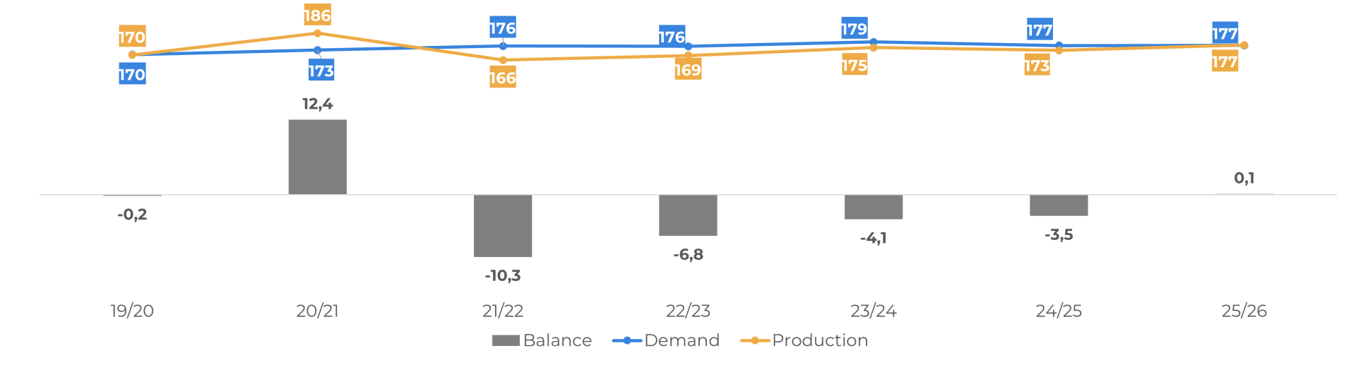 Inicialmente estamos considerando uma ligeira quebra de 1,1% na demanda em 24/25 (o atual ciclo nos destinos) no nosso cenário base, avaliando a atual tendência das importações da UE, mas ainda com um déficit em 24/25. Para 25/26, se considerarmos uma demanda mais estável, o melhor panorama seria um saldo próximo de zero. Novas tarifas dos EUA, no entanto, podem mudar o cenário.