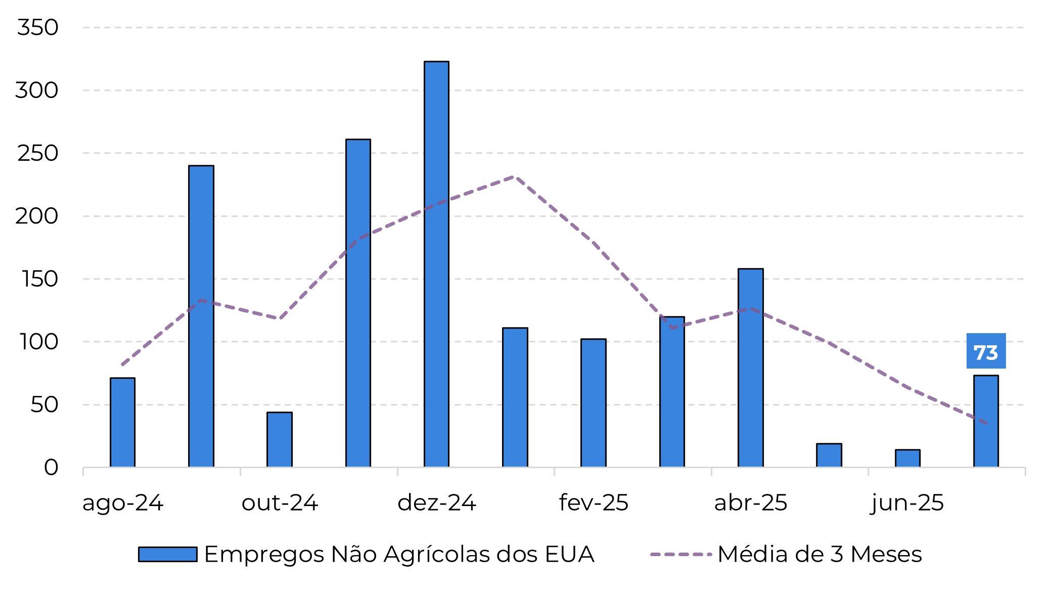 Embora em linha com as expectativas, o IPC aumentou 0,3% em junho, elevando a taxa de inflação de 12 meses para 2,7%, acima da meta de 2% do Fed. Alguns analistas apontam que parte do movimento se deve ao efeito das tarifas, e esperam um crescimento maior nos próximos meses. Na última sexta-feira (01), a atualização da geração de empregos não agrícolas dos EUA também preocupou o mercado, já que não apenas os números de julho ficaram abaixo da expectativa do mercado, mas os números de junho e maio também foram revisados para baixo.
