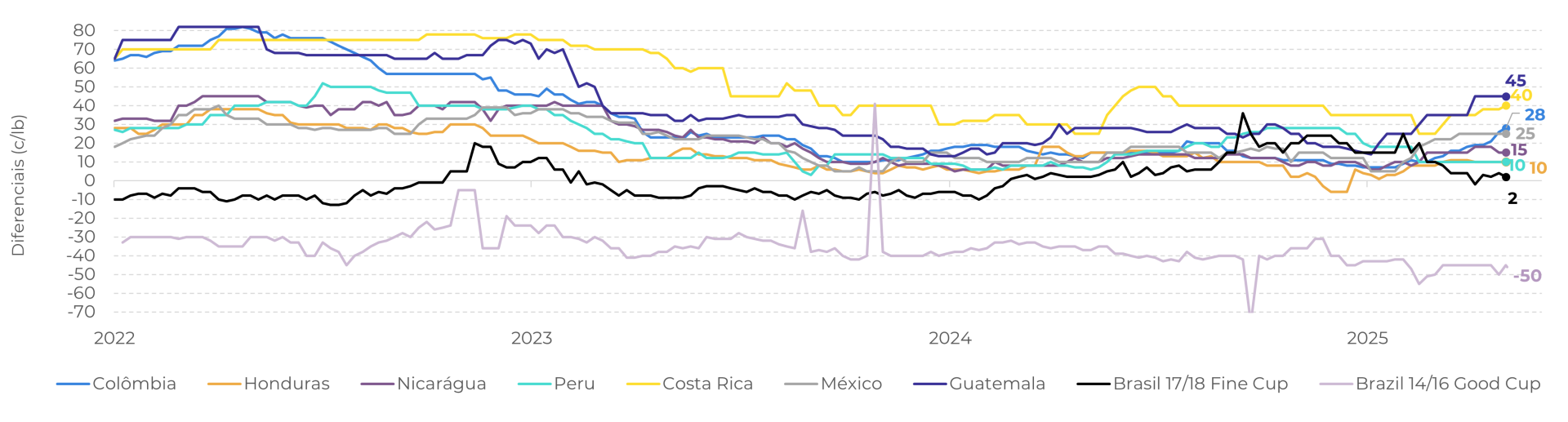 Nas últimas semanas, a oferta pressionou para baixo os diferenciais brasileiros, que haviam permanecido acima dos de outras origens durante a maior parte do primeiro semestre de 2025. No entanto, como essas origens também estão na entressafra, o mundo dependerá mais do grão brasileiro. Isso poderia fornecer um suporte aos preços no curto prazo, uma vez que cafeicultores têm pouco interesse em novas vendas.