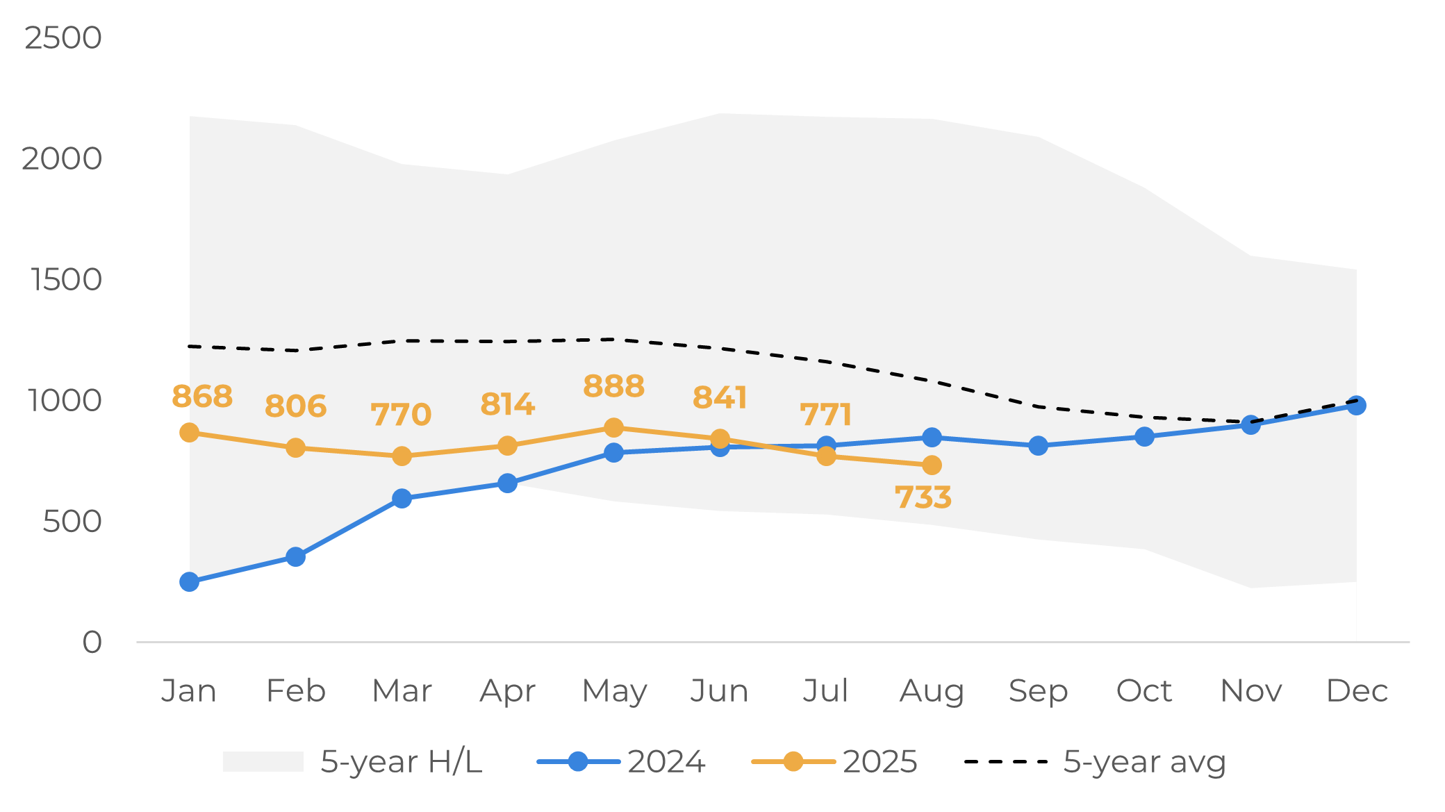 Além das geadas, o mercado também tem acompanhado as quedas consecutivas nos estoques certificados pela ICE para o Arábica na semana passada (veja o relatório aqui). Os estoques estão abaixo da média e dos níveis de 2024, com uma queda significativa da participação dos grãos brasileiros e um baixo volume de café pendente para classificação, o que pode potencialmente destacar um desafio na recuperação do volume. Não só os diferenciais brasileiros atuais não favorecem o envio de café para estoques certificados, mas os cafeicultores continuam a mostrar pouco interesse em negociar grandes volumes.