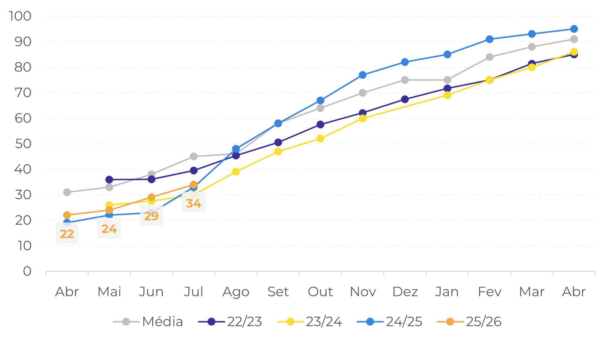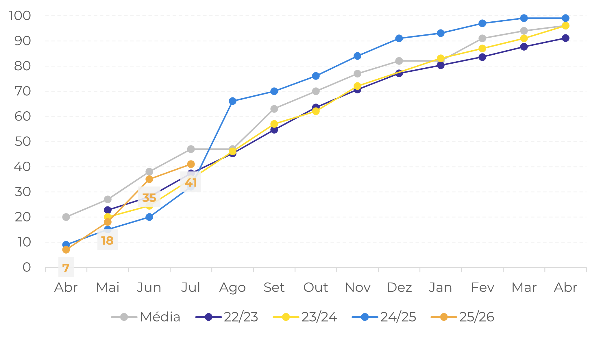 Embora a atual situação comercial entre os EUA e o Brasil continue a trazer mais incerteza ao mercado, estamos caminhando para uma fase importante no desenvolvimento da safra de café em todo o mundo, sendo que qualquer evento climático poderá aumentar a volatilidade. Haverá uma atenção especial à fase de floração da safra brasileira de 26/27, que geralmente ocorre em setembro, após o retorno das chuvas.