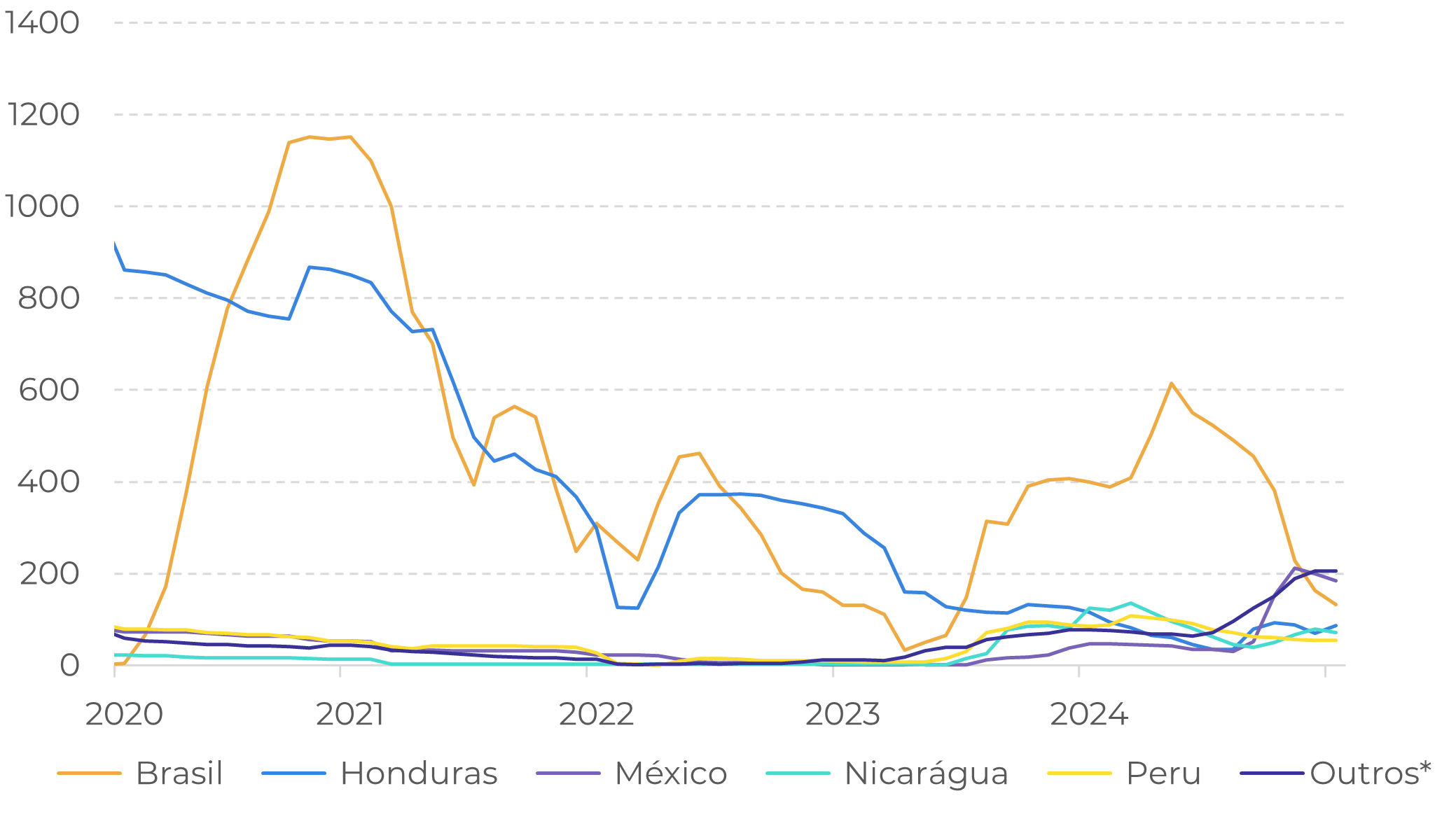 Do lado da demanda, enquanto as empresas americanas começaram a adiar os embarques do Brasil, outras origens têm oferta limitada para oferecer nesse meio tempo. Isso levanta dúvidas sobre a capacidade do país de mudar sua fonte de abastecimento e os possíveis efeitos sobre os preços e o consumo. Fora dos EUA, a EUDR entrará em vigor no final deste ano, o que pode levar a um aumento na procura europeia.