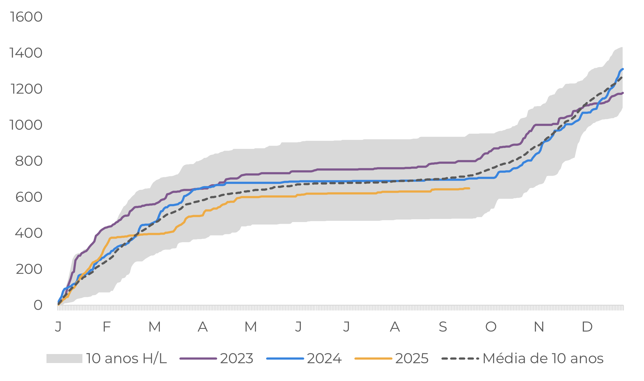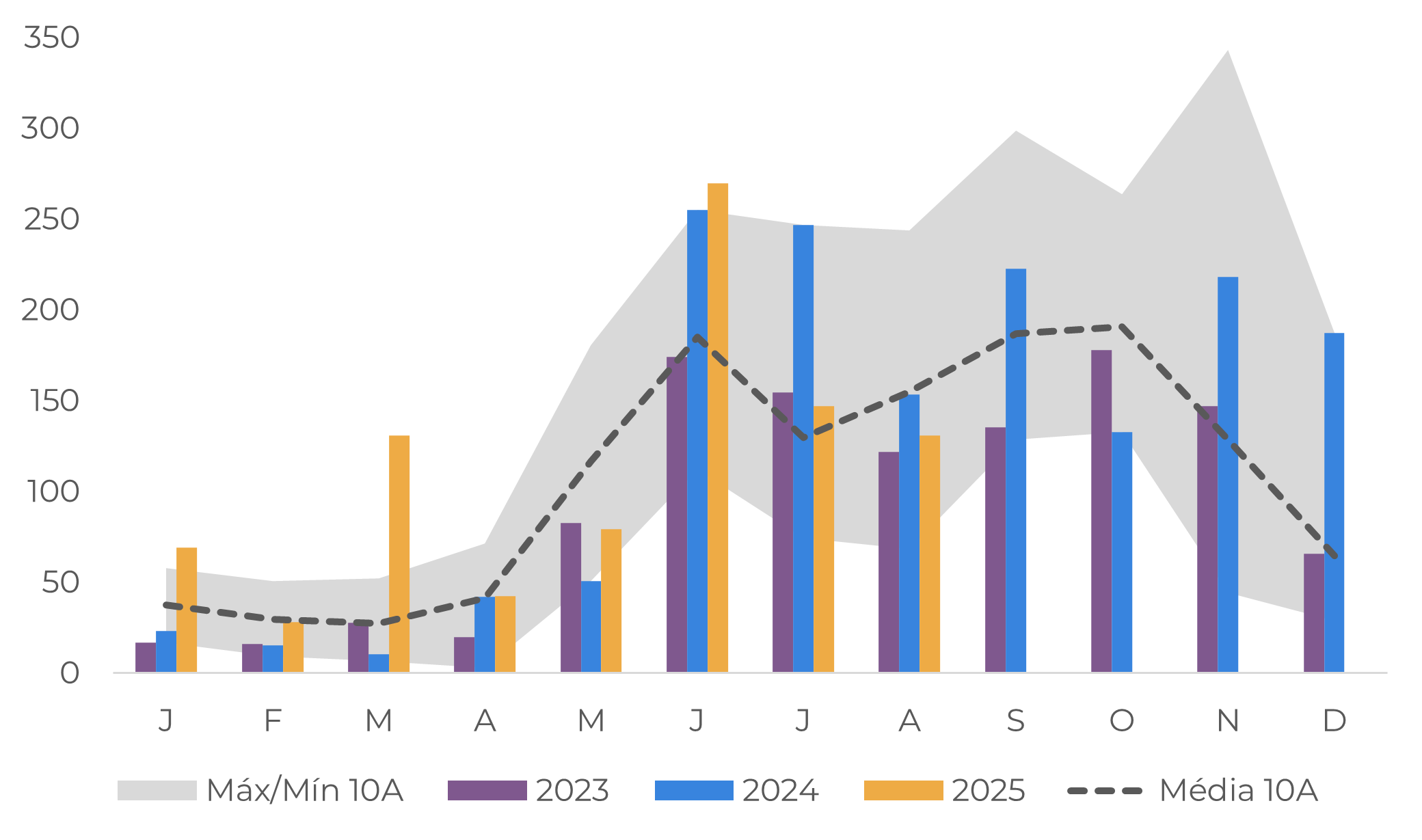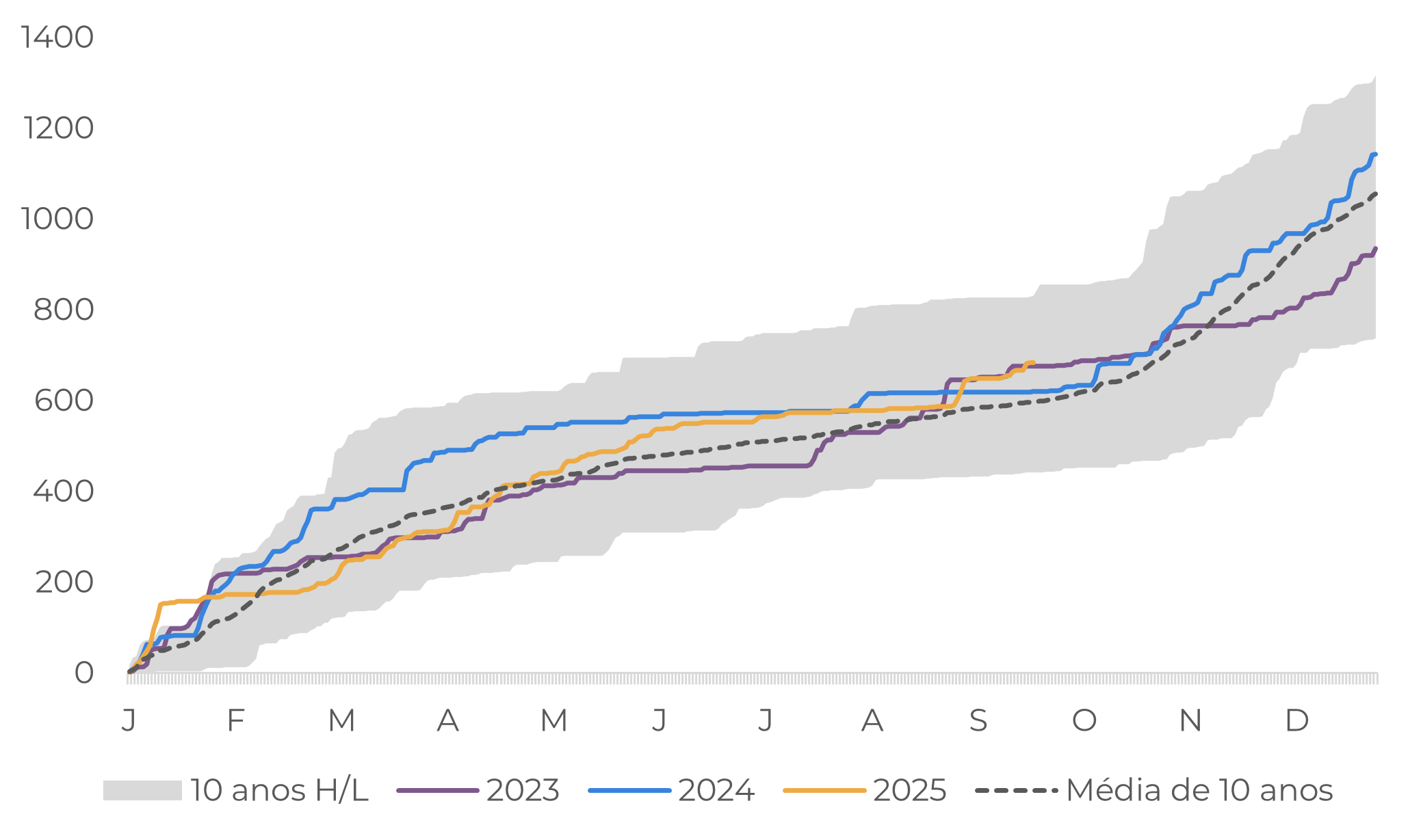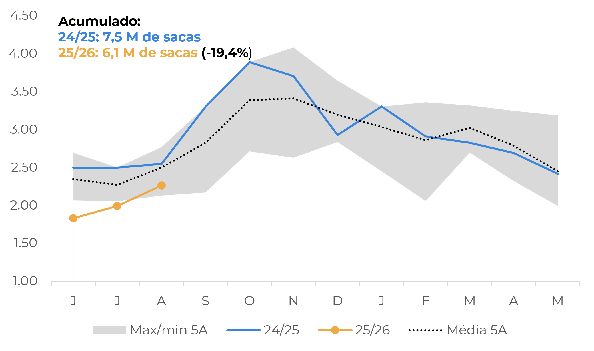 Aumentamos nossa estimativa para o Conilon para 27 M de sacas (+30%) em setembro. Esperamos que as exportações sigam uma tendência semelhante à de 24/25, mas com alguma limitação, dado o aumento esperado no consumo interno da variedade. Para o Arábica, a produção deve diminuir 13,3% em relação a 24/25. Dados os preços mais altos e a expectativa de menor consumo de Arábica, mas maior de Robusta em todo o mundo – devido aos níveis de arbitragem –, esperamos uma redução nas exportações no ciclo. As tarifas dos EUA também devem afetar os números finais.