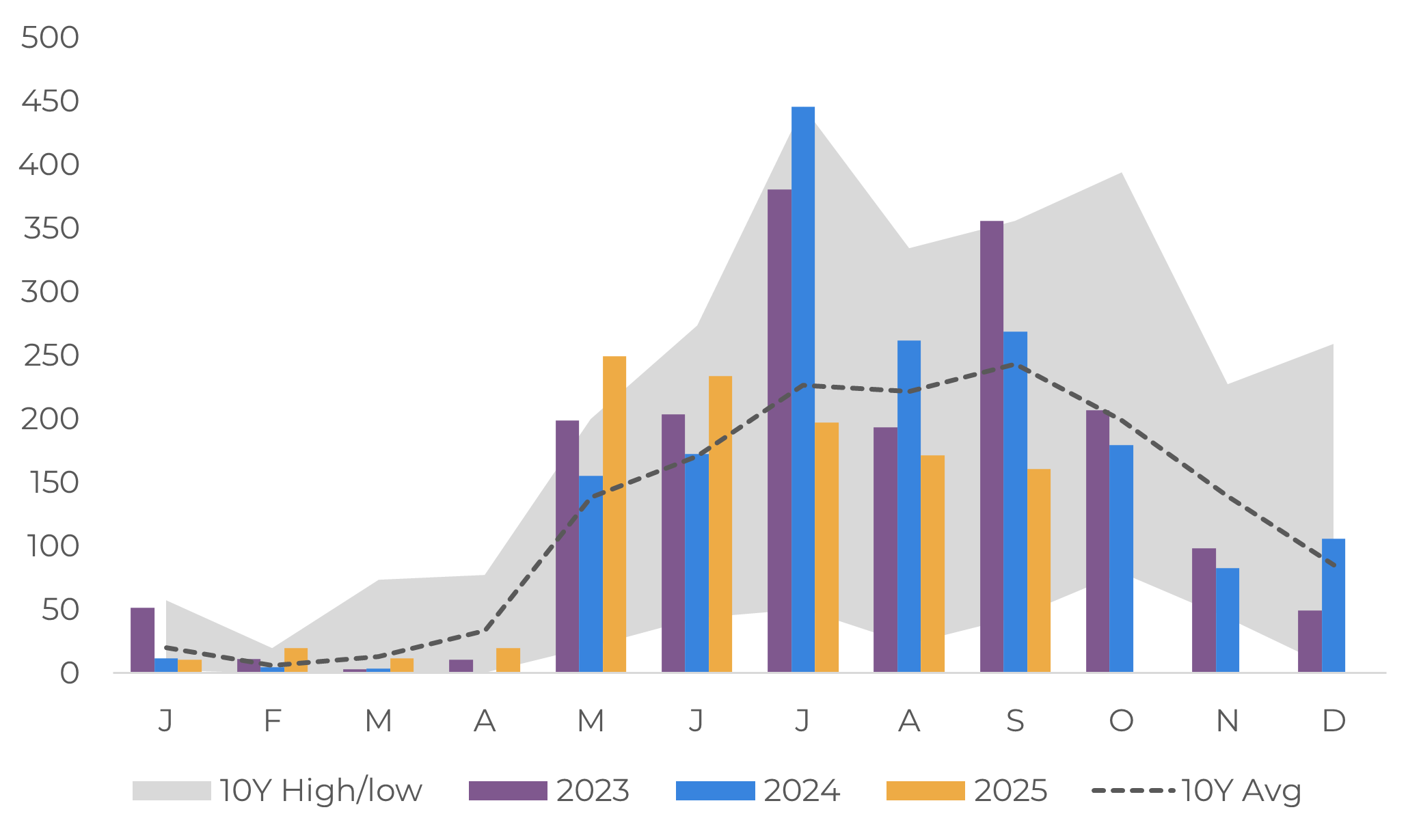 Além dos EUA, na Europa, as importações líquidas acumuladas apontam para uma estabilidade dos níveis 23/24 por enquanto, mas os dados semanais de importação de setembro indicam que a tendência ainda é de importações mais lentas em 2025. Com o EUDR agora adiado novamente, os torrefadores na UE têm mais tempo para comprar café. Por outro lado, o desaparecimento também mostra uma resiliência, em comparação com 23/24.