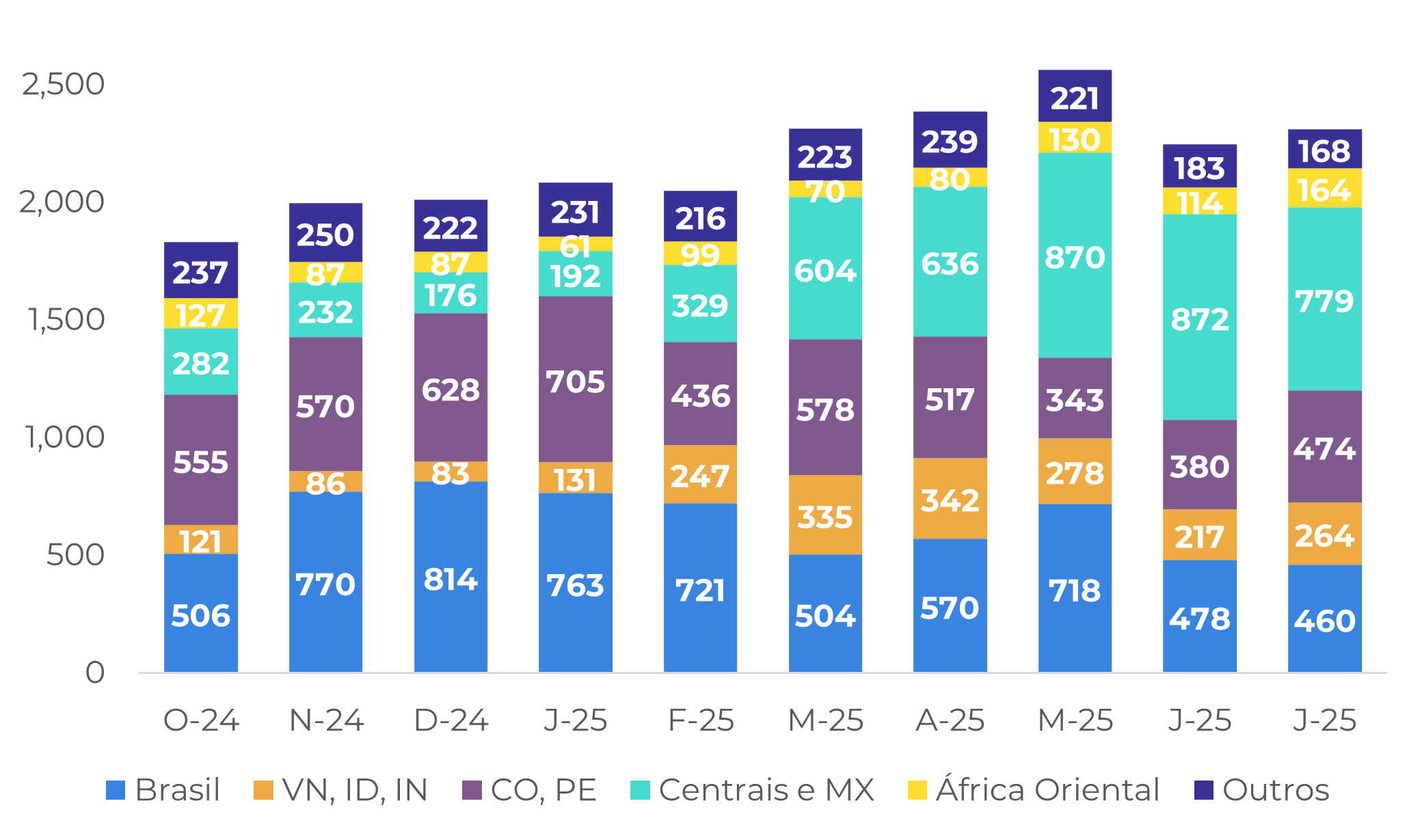 Há também a expectativa de que as importações dos EUA diminuam a partir de agosto. Embora os números acumulados em 24/25 sejam superiores a 22/23 e 23/24, pode haver uma queda após a implementação das tarifas. Espera-se também que as tarifas afetem a participação de cada origem nas importações dos EUA. Embora os números do Brasil tenham diminuído em junho e julho, isso se deveu principalmente à baixa disponibilidade no mercado, mas ainda não vimos o impacto das tarifas. Os dados do Cecafé também mostraram uma queda acentuada de 46% nas exportações brasileiras para os EUA em agosto. Enquanto isso, é provável que vejamos um aumento nas importações da Colômbia, América Central e México, embora limitado, devido ao período de entressafra.