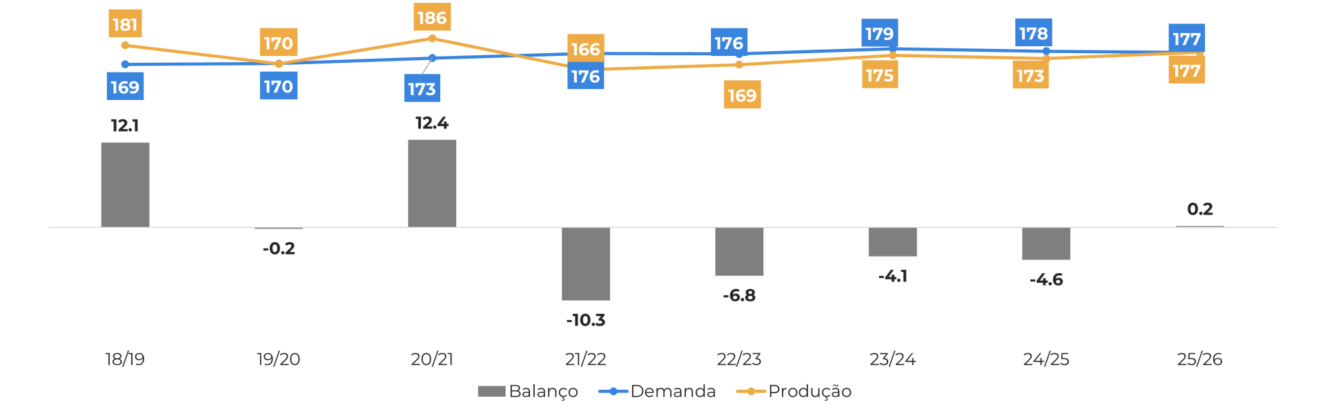 Brasil e no Vietnã, levando a um déficit. Em 25/26, há expectativa de maior