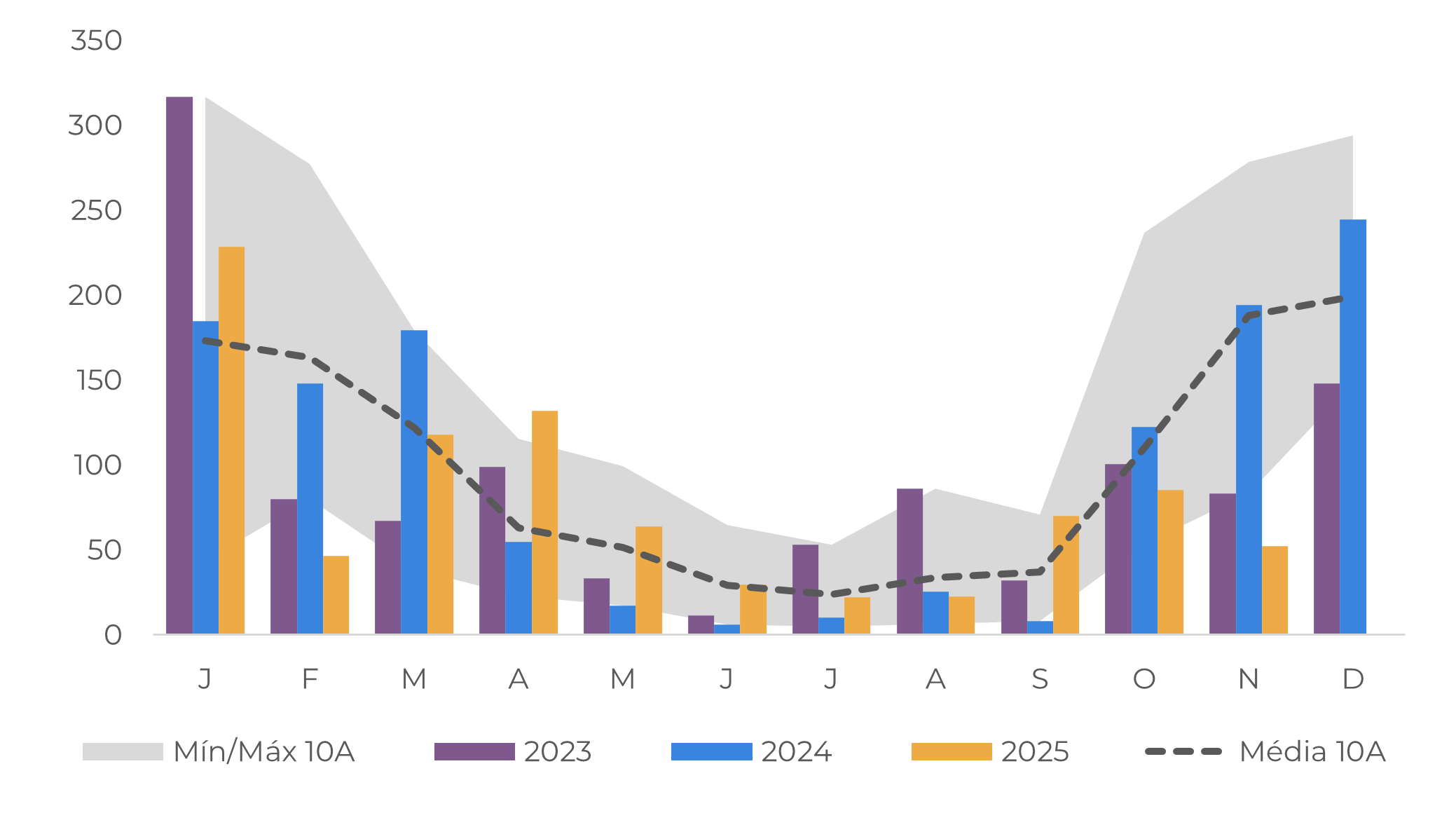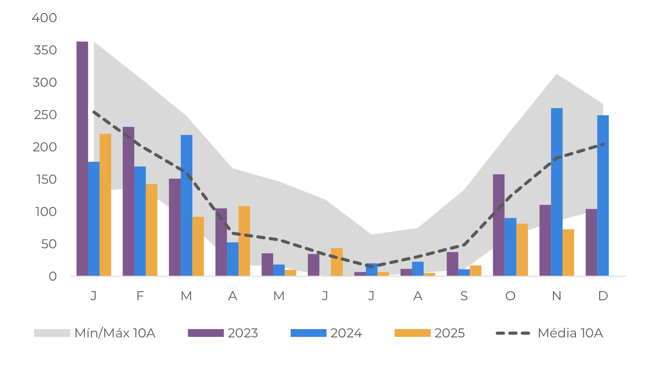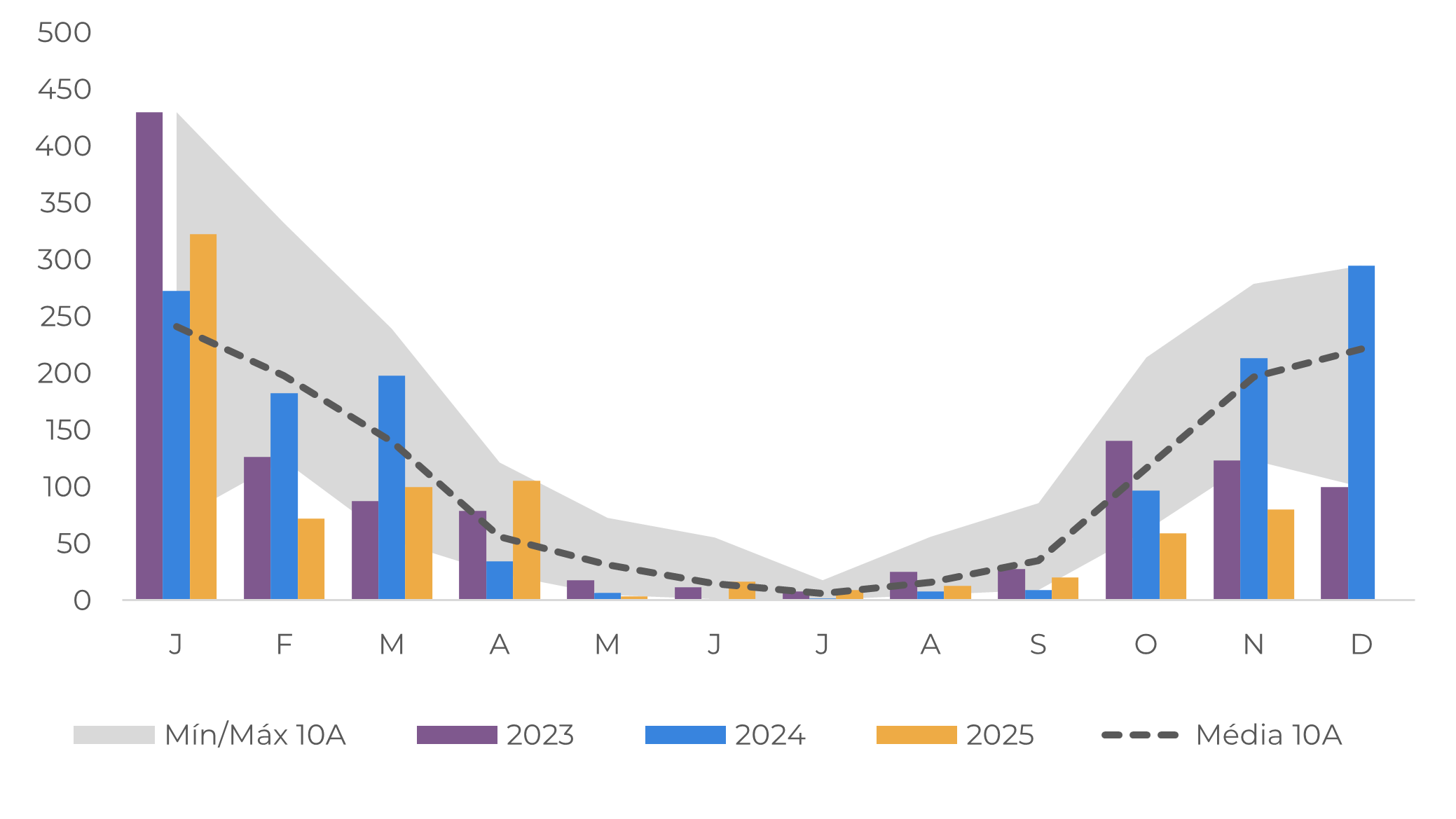 O clima também tem sido monitorado de perto nas últimas semanas e terá um papel importante na movimentação dos preços, já que o Brasil está atualmente em fase de desenvolvimento para o ciclo 26/27. Até meados de outubro, o clima permaneceu seco na maioria das regiões produtoras, trazendo alguns temores para a próxima safra, já que muitos cafeeiros tiveram floração precoce em setembro. No entanto, embora ainda seja cedo para descartar o efeito negativo do clima anterior na produtividade do café, os níveis de chuva na segunda quinzena de outubro e no início de novembro trouxeram esperanças para 26/27.