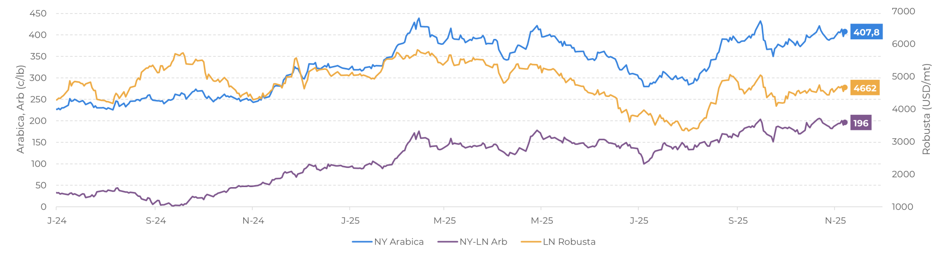 - Os preços futuros do Arábica continuaram altamente voláteis em outubro e no início de novembro. Embora as esperanças de um acordo entre o Brasil e os EUA e as boas chuvas após meados de outubro tenham pesado sobre o lado baixista em parte do mês passado, os preços voltaram a ser negociados acima dos níveis de 400 c/lb nos últimos dias.
