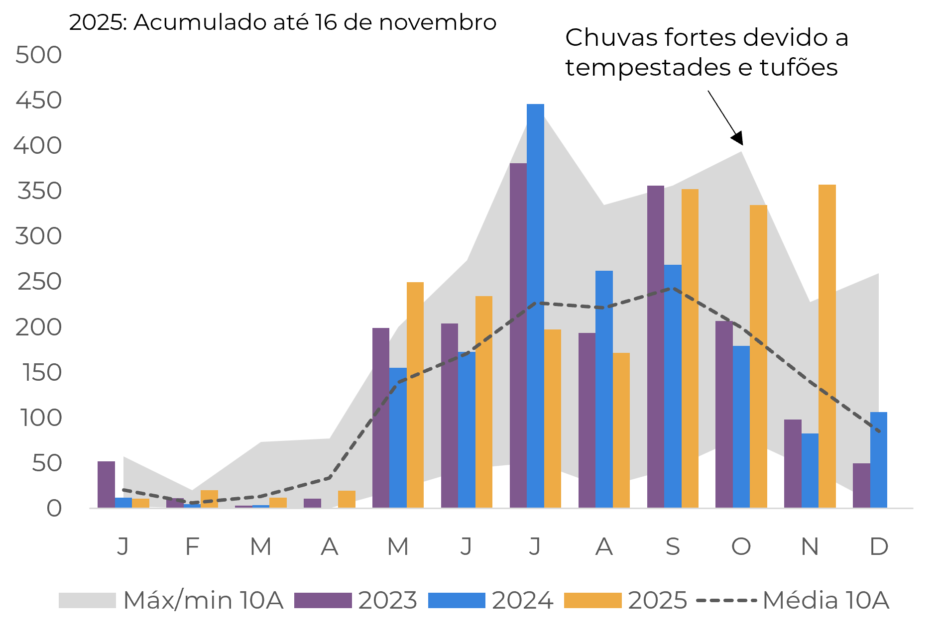 Especialmente no Vietnã, o país sofreu chuvas intensas nos últimos dois meses e, mais recentemente, o tufão Kalmaegi atrapalhou a colheita da safra 25/26 e a logística. Os níveis mais altos de precipitação já estão atrasando o ritmo da colheita e a chegada de maiores volumes de café ao mercado. A chuva também está afetando o processo de secagem dos grãos, diminuindo a qualidade do café.