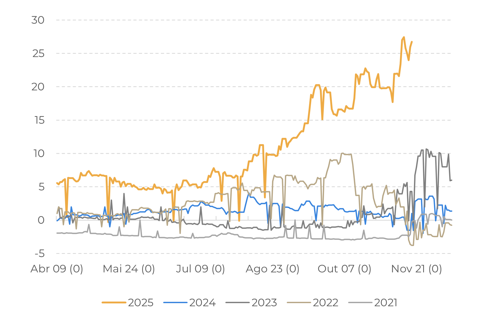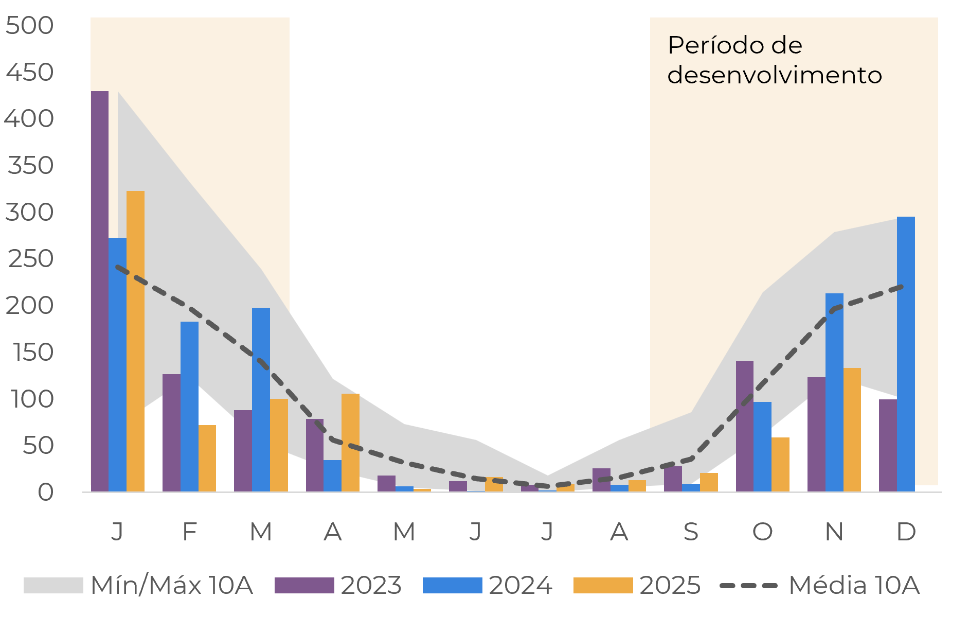 Assim, até meados de novembro, os três principais fatores que influenciaram os preços foram as tarifas, os estoques certificados e o ciclo brasileiro 26/27. Como as tarifas foram suspensas, isso remove parte da pressão de alta atual e pode permitir a recuperação dos estoques da ICE, deixando o desenvolvimento da safra brasileira como o principal fator de risco (e indicador de preço) no mercado.