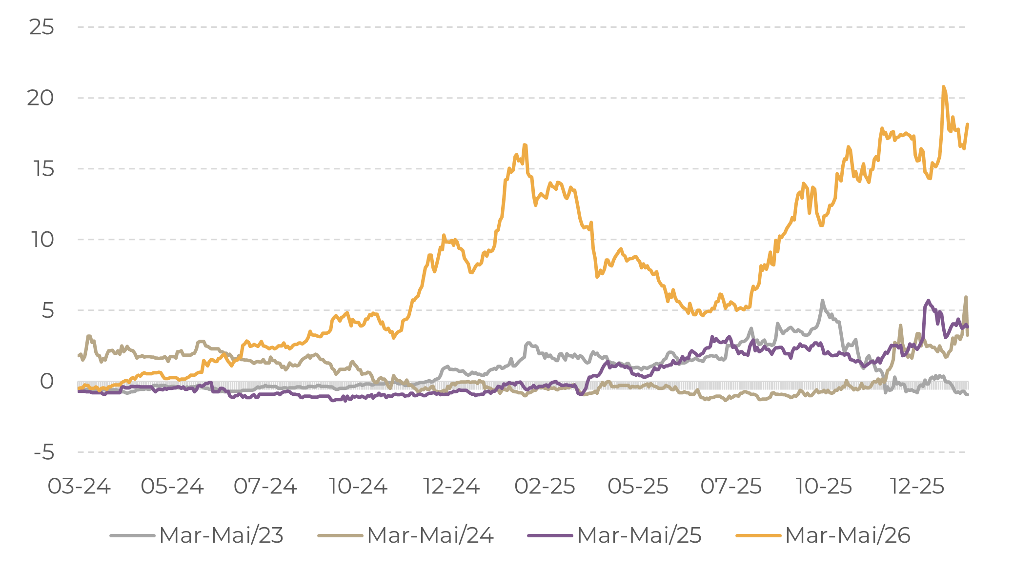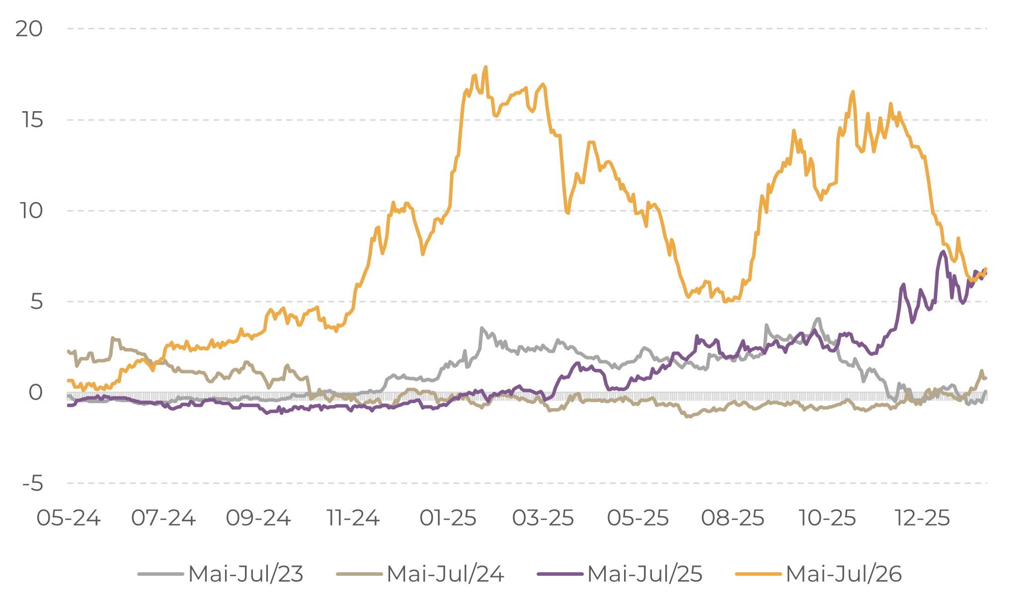 Por outro lado, o spread maio-julho vem diminuindo nas últimas semanas, refletindo as expectativas do mercado de aumento da oferta com a aproximação da safra brasileira em meados de 2026. À medida que os agricultores se preparam para uma safra maior, é provável que aumentem as vendas para cobrir os custos da colheita, o que poderia exercer pressão baixista sobre os preços, especialmente sobre o contrato de julho.
