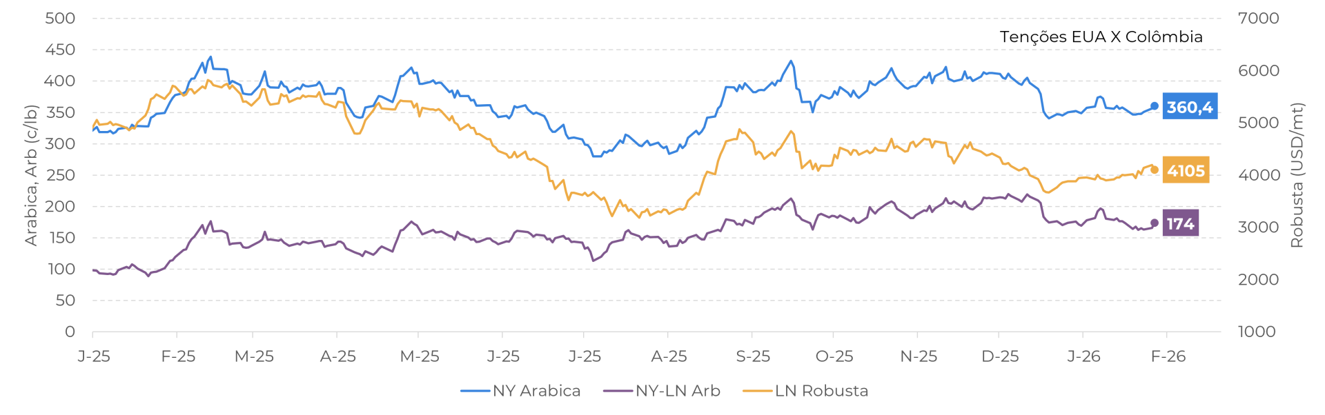 O mercado de café tem estado silencioso nos últimos dias, pois o mercado aguarda novos fundamentos. Embora no início de 2026 os preços tenham subido e novas vendas foram relatadas, isso foi principalmente um reflexo dos temores em relação a possíveis conflitos entre a Colômbia – um dos maiores produtores de café do mundo – e os EUA, após a operação militar país norte-americano na Venezuela. No entanto, como o impasse diplomático entre as duas nações perdeu intensidade nas últimas semanas, os agentes do mercado do café voltaram sua atenção para o desenvolvimento da safra 26/27 no Brasil e a colheita da safra 25/26 em outros produtores, com reportes de negócios mais calmos nessas primeiras semanas de 2026.