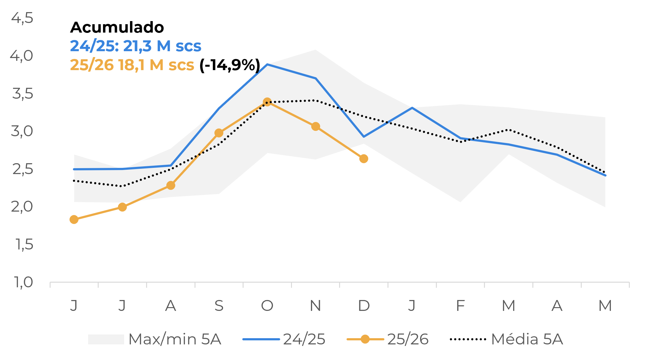 As exportações brasileiras da safra 25/26 do país também continuam apresentando desempenho inferior em comparação com o último ciclo. Os embarques totais ficaram em 3,13 milhões de sacas em dezembro de 2025, 20,2% abaixo de 2024, com uma queda de 10% nos números do Arábica (2,63 milhões de sacas) e de 61,1% para o Conilon (222,15 mil sacas). Além do ritmo lento das vendas, as tarifas americanas em vigor sobre o café solúvel também contribuíram para a queda. Também era esperada uma redução nas exportações em comparação com o ciclo 24/25, dado o recorde desse indicador na última temporada.