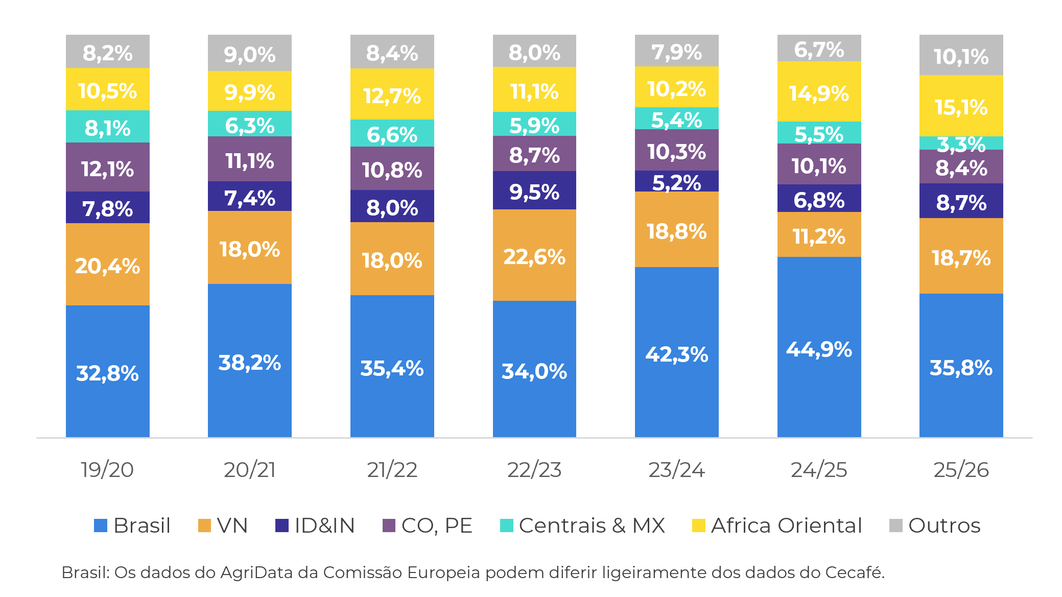 - O desaparecimento/consumo aparente também mostra fraqueza no ciclo 25/26, provavelmente um reflexo das importações líquidas mais baixas nos últimos meses, com os preços mais altos do café no ano passado afetando a demanda na UE.