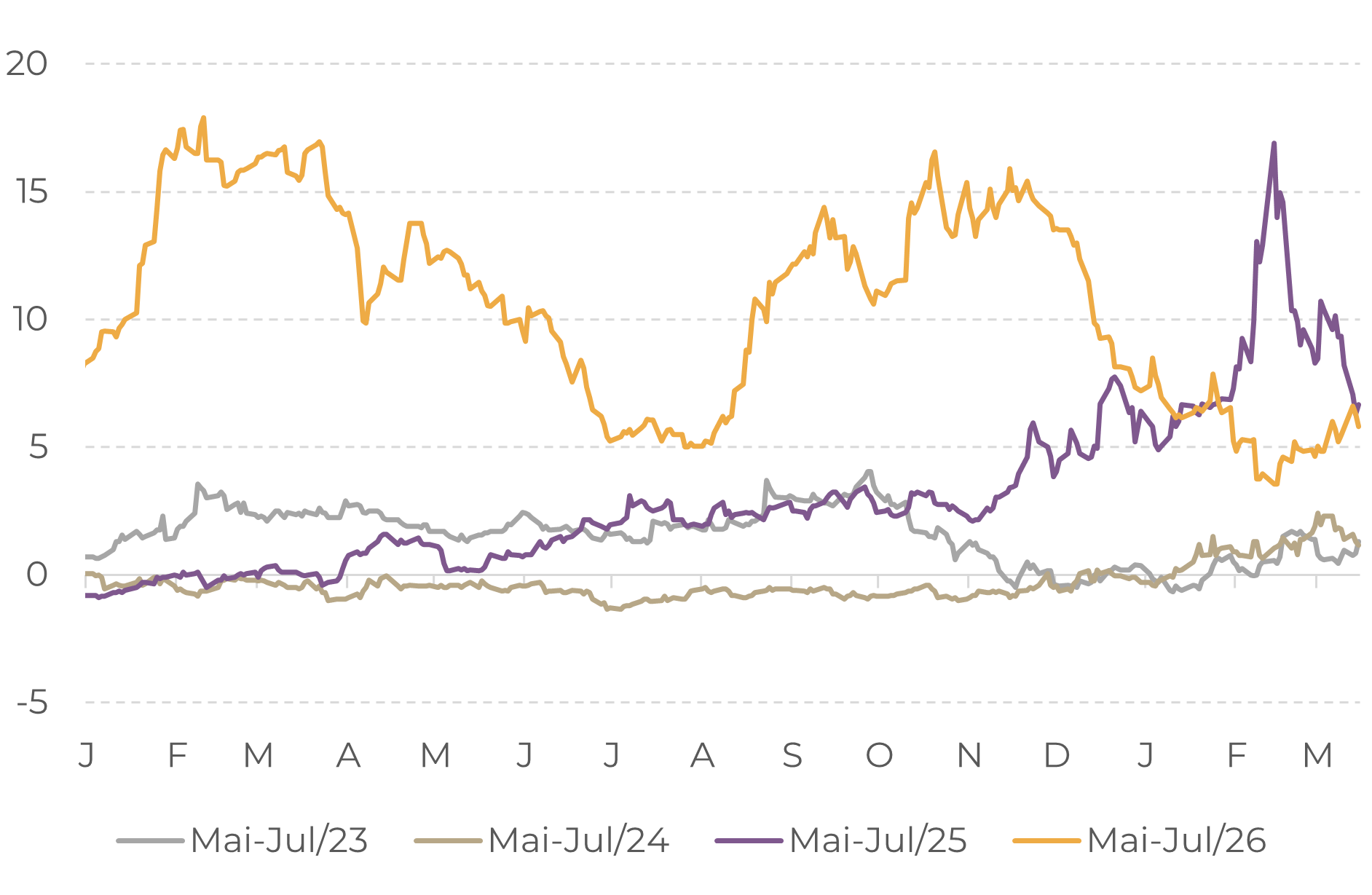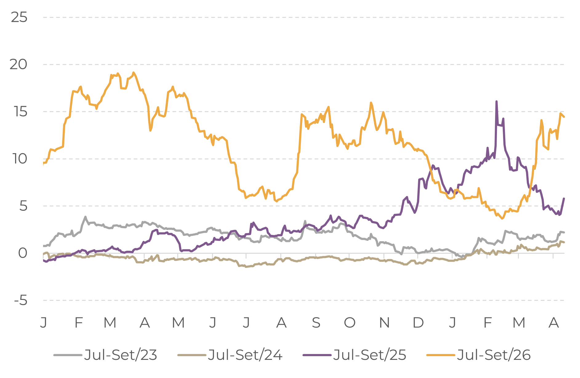 Após uma queda acentuada no início deste ano, os spreads dos contratos de vencimento mais próximo aumentaram, especialmente o de julho-setembro, refletindo as preocupações com a oferta no curto prazo, já que produtores continuam a reter as vendas, especialmente no Brasil.