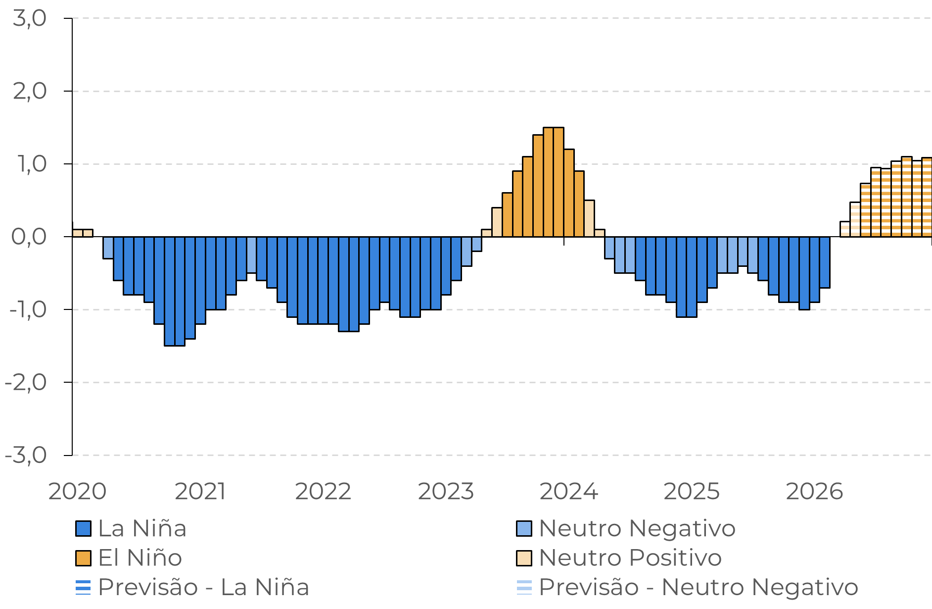 Os modelos atuais também apontam para um aumento significativo nas temperaturas do Pacífico no final de 2026, o que poderia se traduzir em um evento forte nesse período. Isso é significante uma vez que, com exceção da Indonésia, todos os demais produtores estão em seu principal período de desenvolvimento para a safra 26/27, com o clima desempenhando um papel fundamental nos números de produção e no excedente global. Dessa forma, um forte El Niño poderia afetar os fluxos comerciais.