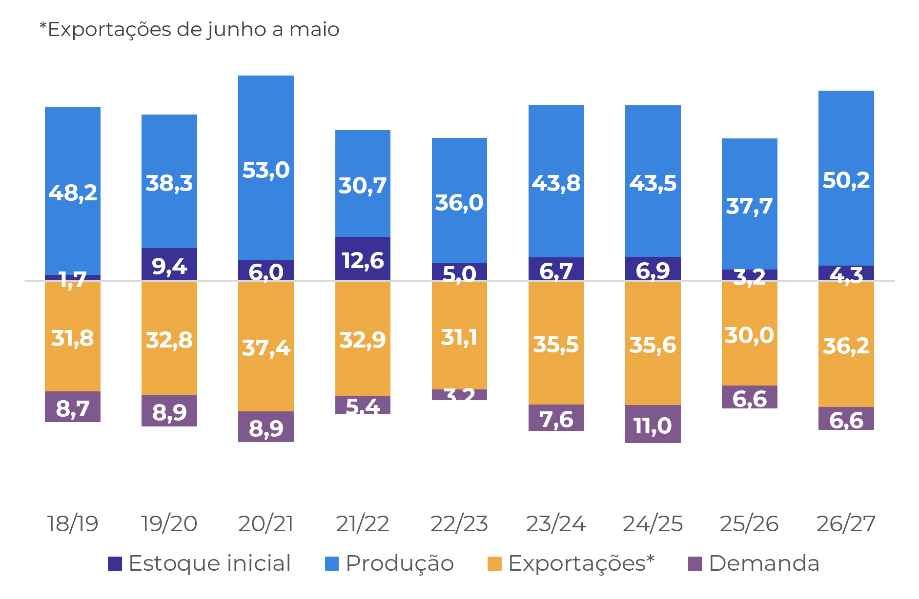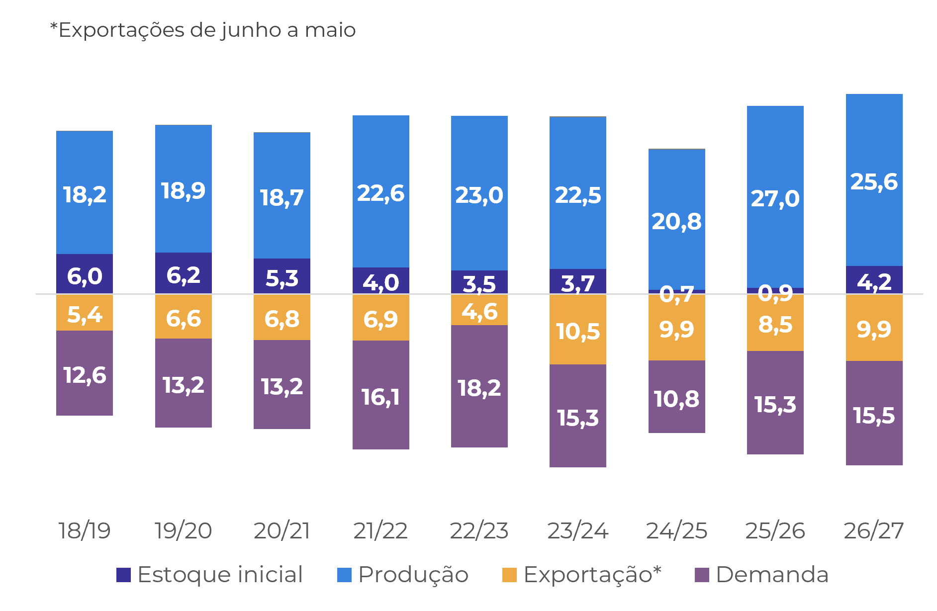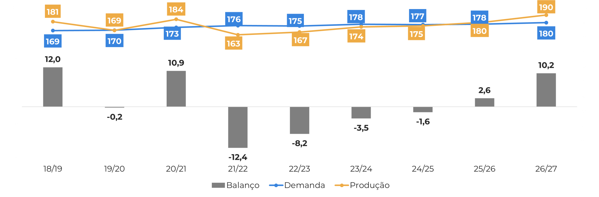 Após algumas safras em um cenário de escassez, o balanço do café poderá finalmente apresentar um superávit significativo na safra 26/27, principalmente devido à safra recorde no Brasil. No entanto, é importante observar que, com outras origens em fase de desenvolvimento, a magnitude desse superávit pode sofrer alterações. Também estamos adotando uma abordagem mais conservadora em relação à demanda.